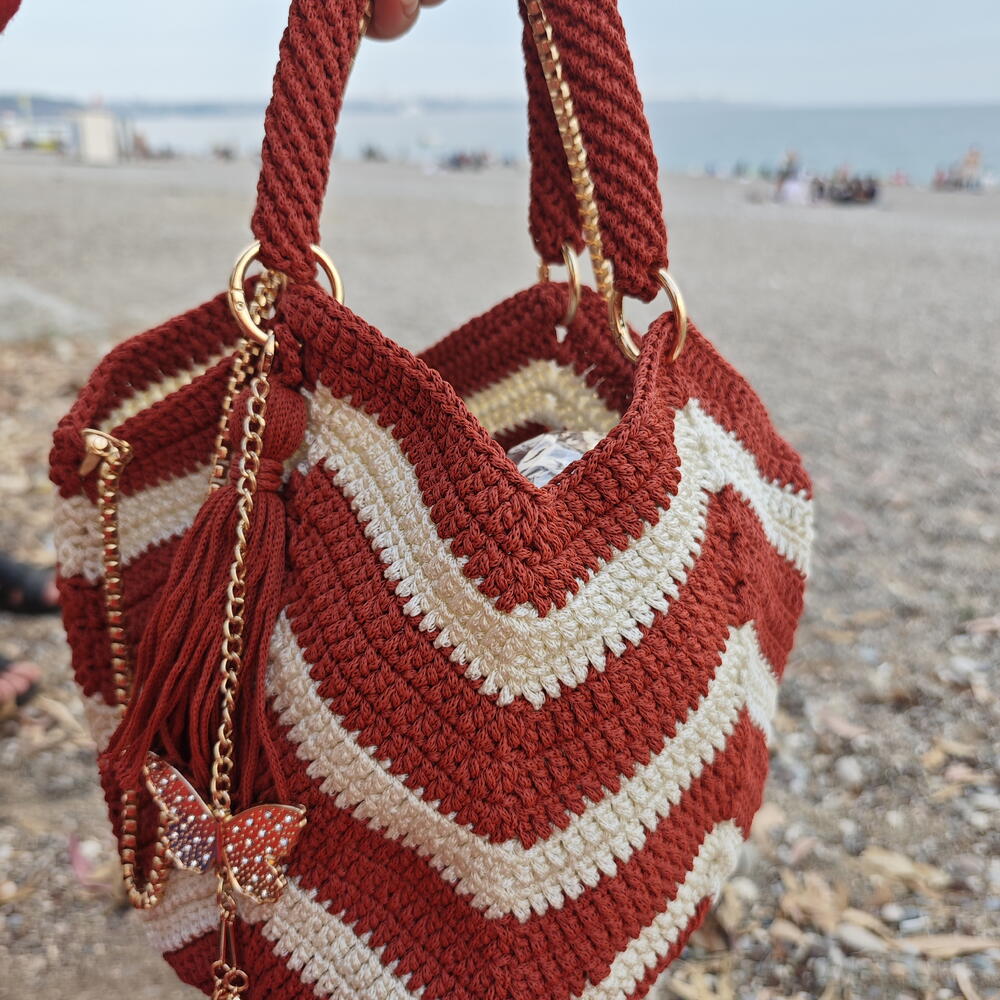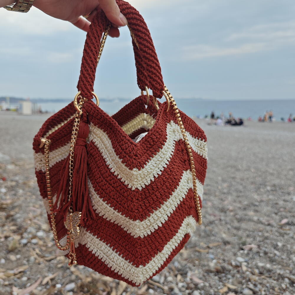 Gün batımında sahilde yürürken yanınızda taşıyacağınız bir parça hayal edin… Bu el yapımı çanta, sıcak kiremit ve yumuşak krem tonlarıyla örülmüş chevron deseniyle hem nostaljik hem modern bir hava taşıyor. Altın zincir detayları ve zarif püskülüyle her dokunuşta özen hissi uyandırıyor. ✨ Neden Seveceksiniz? - %100 el emeğiyle örülmüştür - Yumuşak dokulu iplerle şekillendirilmiştir - Altın zincir askılar ve dekoratif püskül ile tamamlanmıştır - Günlük kullanım için ideal boyutta - Sahil yürüyüşlerinden şehir gezilerine kadar her anınıza eşlik eder 🎁 Kendinize küçük bir mutluluk ya da sevdiklerinize anlamlı bir hediye arıyorsanız, bu çanta tam size göre.
