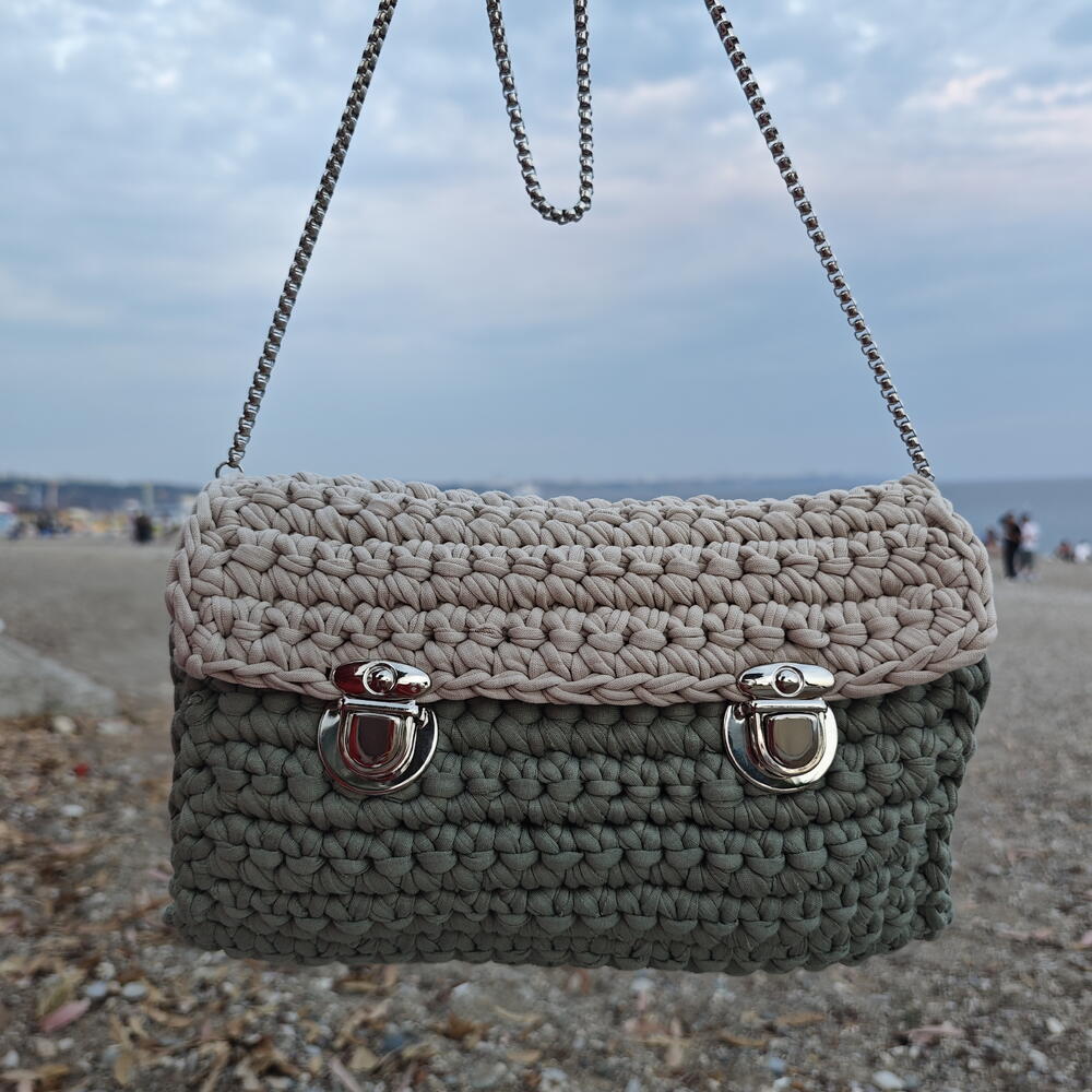 El Yapımı Örgu Penye Çanta Yeşil - Bej