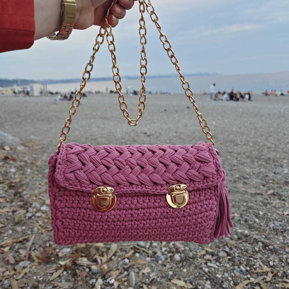 🌿 El emeğiyle örülmüş, sahil esintili bir zarafet… Bu canlı pembe çanta, yumuşak penye ipten özenle örüldü. Altın zincir askısı ve çift tokalı kapak tasarımıyla hem nostaljik hem modern bir dokunuş sunar. Yanındaki püskül detayı ise hareketli ruhunu tamamlıyor. Gün batımında sahilde yürürken ya da şehirde bir kahve molasında… Bu çanta, her anınıza sıcaklık ve stil katmak için tasarlandı. 🎁 Hediye arayanlara özel: Duygusal bağ kuran tasarımıyla sevdiklerinize anlamlı bir armağan sunabilirsiniz. Her detayında sevgi var. İpin kalınlığından dolayı bir kaç cm değişebilir.