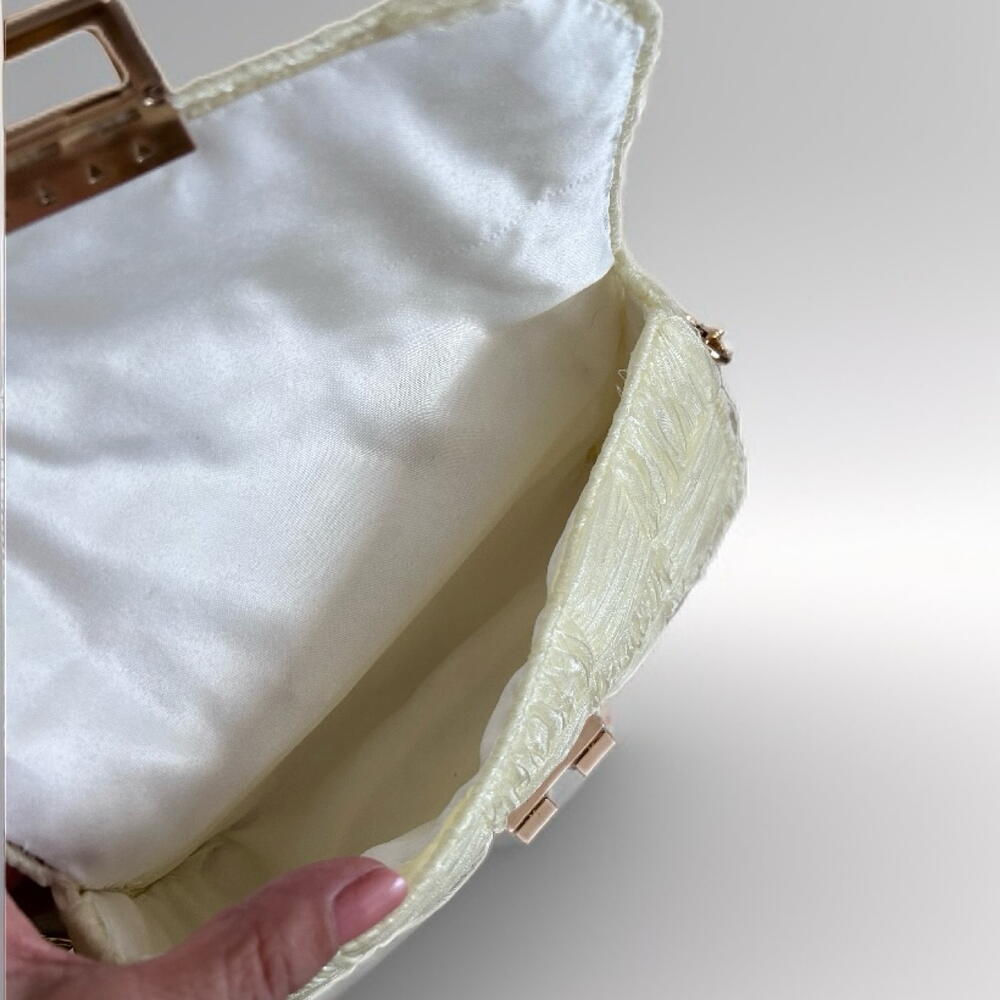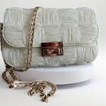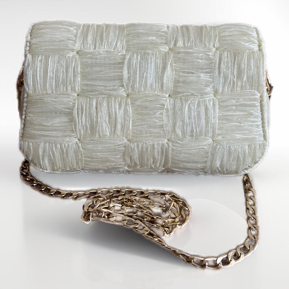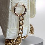 Bu zarif çanta, organze kurdele malzemesinin narinliği ve gold renk aksesuarın ışıltısı ile birleşiyor. Dayanıklı astar ile güçlendirilmiştir. Hem pratikliği hem de şıklığı bir arada sunan bu çanta, her gardırobun vazgeçilmez bir parçası olacak.