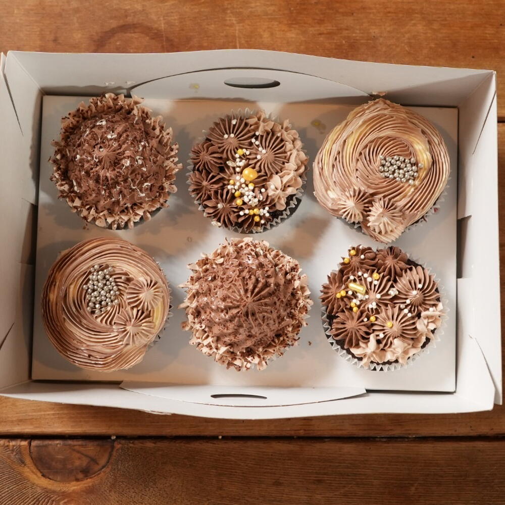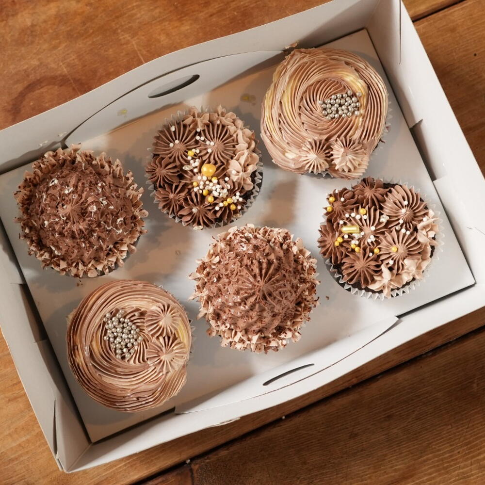 6 adet kakaolu cupcake . İsteğe göre çikolata dolgulu hazırlanır . Swiss mereng buttercream ile hazırlanır . Özel kutusunda gönderilir.