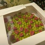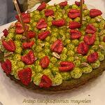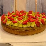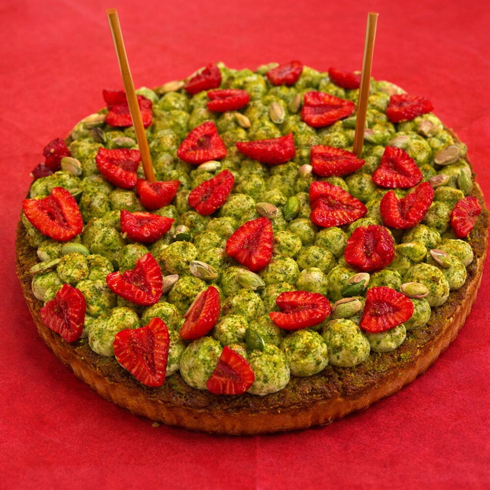 Antep fıstıklı frangipane, vişne ile pişen tart üzerinde, antep fıstıklı krema ve taze ahududular Tart tabanı (un, tereyağı) Antep fıstığı (toz/parça) Pastacı kreması / fıstıklı krema (süt/krema, şeker, yumurta) Çilek (taze) Üzeri: Antep fıstığı parçaları
