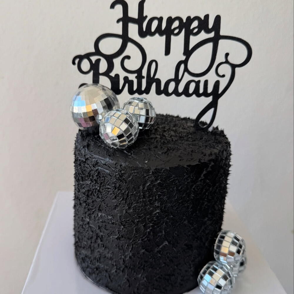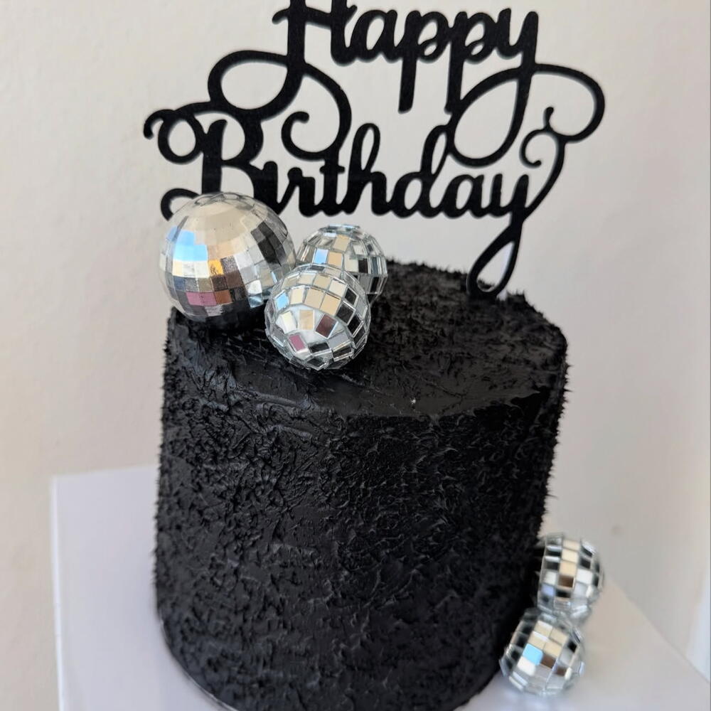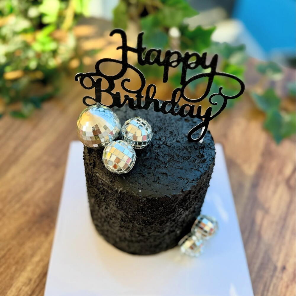 Mağara dokusuna sahip siyah kremalı kek. Üzerinde ışıltılı disco topları ve happy birthday siyah kadife doku yazı mevcut