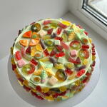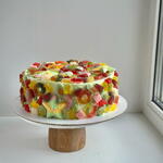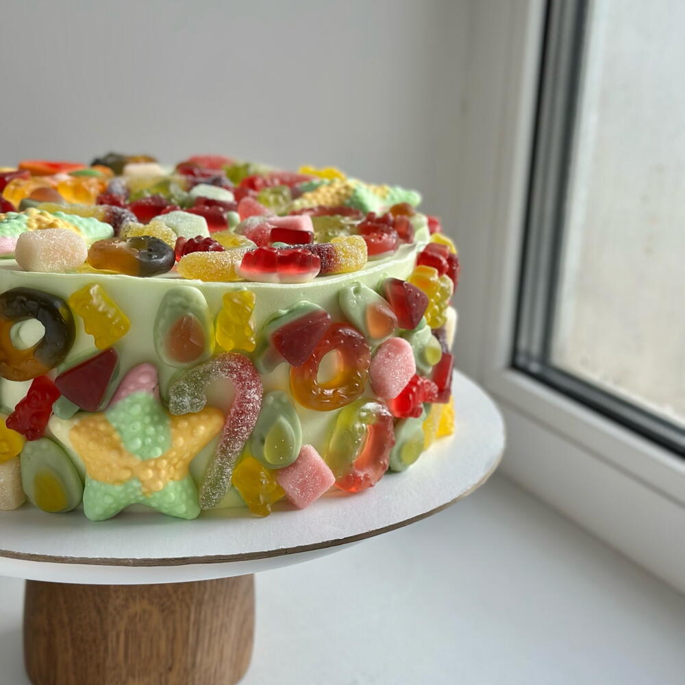 Renkli jelibonlar ve şekerlemelerle süslenmiş, canlı ve eğlenceli bir pasta. Bu neşeli tasarım, kutlama havası yaratarak doğum günleri, partiler ve özel organizasyonlar için mükemmel bir seçim sunar. Yumuşak pandispanya katları ve zarif krema dolgusu sayesinde pasta sadece göz alıcı değil, aynı zamanda çok lezzetlidir. Tatlıları ve rengârenk lezzetleri seven hem çocuklar hem de yetişkinler için harika bir tatlıdır.