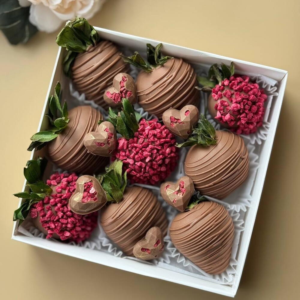 Sevgiyle el yapımı premium çikolata kaplı çileklerimizin tadını çıkarın 🍓 Her bir çilek özenle yumuşak sütlü çikolataya batırılır ve narin detaylarla süslenir — dondurularak kurutulmuş ahududular ve el yapımı çikolata kalpler. Romantik bir hediye, tatlı bir sürpriz veya kendiniz için lüks bir ikram olarak mükemmeldir. Taze, zarif ve dayanılmaz derecede lezzetli. ✨ Yüksek kaliteli malzemelerle yapıldı ✨ Güzel hediye paketlemesi ✨ Aynı gün hazırlama mevcut