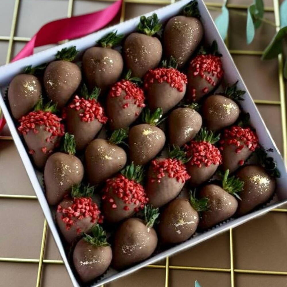 Zarafetle el yapımı çikolata kaplı çileklerden oluşan lüks kutu 🍓✨ Her bir çilek pürüzsüz süt çikolatasına batırılır ve narin dondurularak kurutulmuş ahududu dokunuşlarıyla hafif bir altın ışıltıyla tamamlanır — zarif ve karşı konulmaz bir görünüm yaratır. Özel anlar için mükemmel hediye — şık, zarif ve lezzet dolu. ✨ Birinci sınıf taze çilekler ✨ Doğal içerikler, katkı maddesi yok ✨ Zarif hediye sunumu ✨ Her gün taze hazırlanır