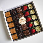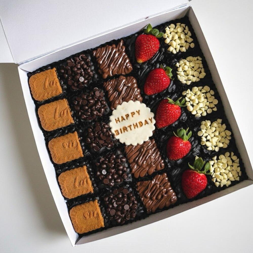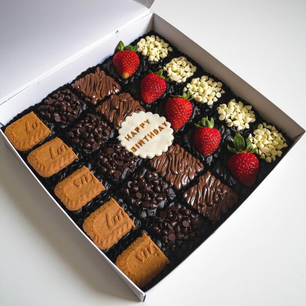 Özel tasarım doğum günü browniemiz, yoğun çikolatalı dokusunu üç farklı lezzet grubuyla buluşturarak hem göze hem damağa şölene dönüştürür. Üzeri Lotus bisküvileri, çikolata damlaları, sütlü çikolata şeritleri, beyaz çikolata parçacıkları ve taze çileklerle özenle süslenmiştir. Her bölümde farklı bir tat deneyimi sunan bu mozaik görünüm, kutlamalarınıza renk ve tatlı bir zarafet katar. Orta kısımda yer alan kişiye özel mesaj plakası hediyenizi daha anlamlı hâle getirir. Browniyi doğrudan güneş ışığından uzak tutarak serin ve kuru bir ortamda muhafaza etmenizi öneririz. Servisten önce birkaç dakika oda sıcaklığında bekletmek, hem aromayı hem kıvamı en iyi hâliyle ortaya çıkarır. Doğum günleri, özel günler ve sürpriz kutlamalar için mükemmel bir seçenektir.