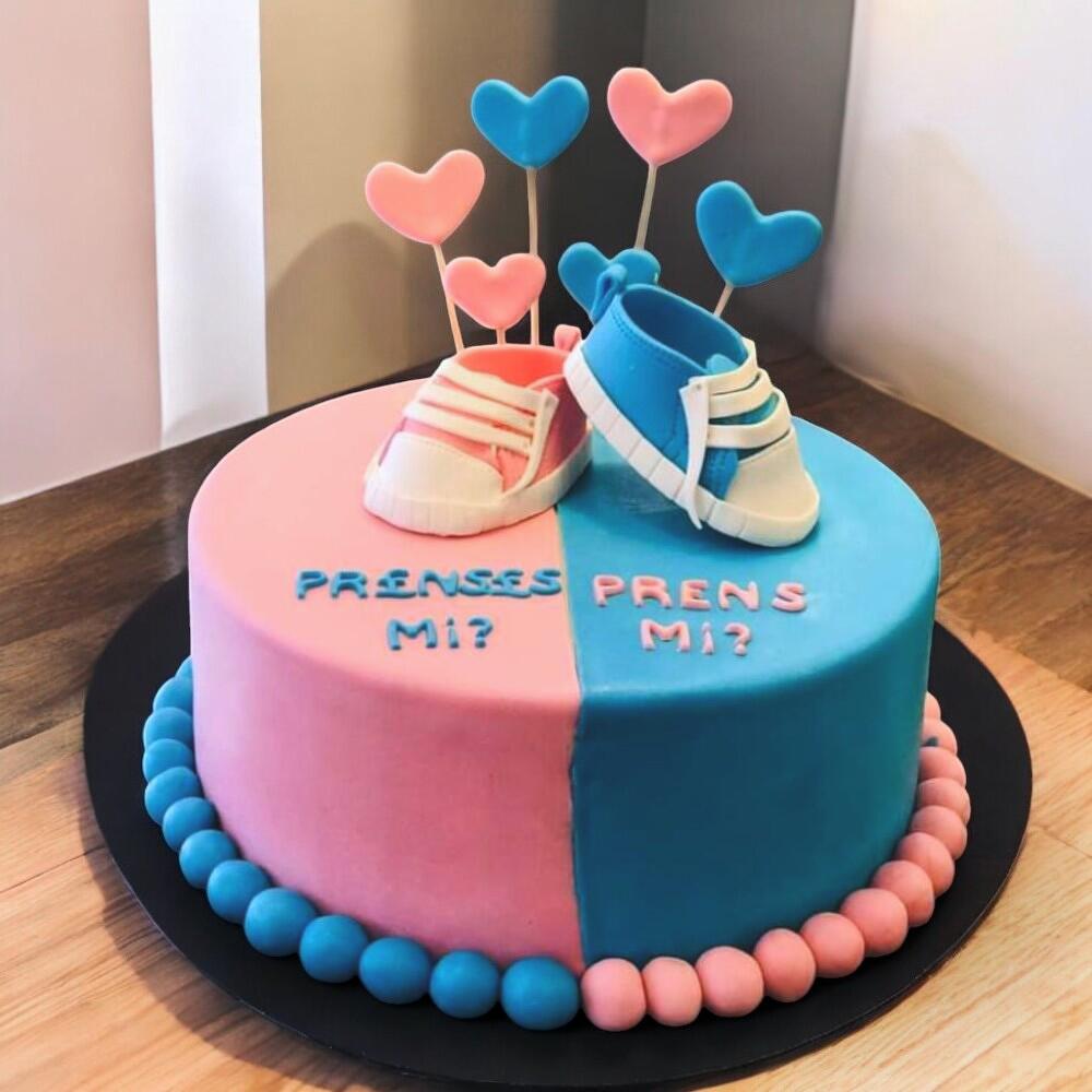 Bu harika doğum günü pastası, erkek ve kız bebek için yapılmış şık bir tasarıma sahip! Pastanın yarısı pembe, diğer yarısı ise mavi renkte ve üzerinde Prenses mi? ve Prens mi? yazıları yer alıyor. Üzerindeki beyaz ayakkabılar, her iki cinsiyet için de uyumlu bir seçim olmuş. Ayrıca, pastel tonlarındaki kalp şekilleri ve şeker topakları pastanın etrafını zarif bir şekilde sarmakta. Hem renkli hem de neşeli bir görünüm sunarak, bebek cinsiyetine dair heyecanı kutlamak için mükemmel bir seçim. Bu tatlı pastayla, sevdiklerinize unutulmaz bir kutlama deneyimi sunabilirsiniz.