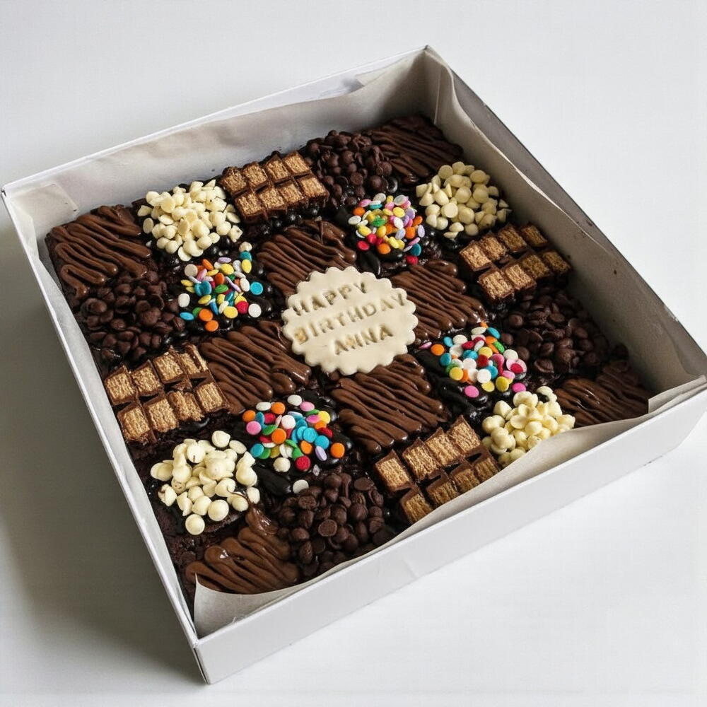 Görsel bir şölen sunan özel tasarım doğum günü browniemiz, yoğun çikolatalı dokusunu renkli ve zengin süslemelerle bir araya getirerek kutlamalarınıza eşsiz bir lezzet katar. Üzeri draje, beyaz çikolata parçacıkları, mini gofretler ve çikolata damlalarıyla mozaik deseninde özenle süslenmiştir. Her lokmada farklı bir tat ve kıvam sunarak hem göze hem damağa hitap eder. Ortasındaki kişiye özel hazırlanmış mesaj bölümü, bu tatlıyı daha anlamlı ve unutulmaz bir hediye haline getirir. Browniyi serin ve kuru bir ortamda saklamanızı, güneş ışığından uzak tutmanızı öneririz. Servis etmeden önce birkaç dakika oda sıcaklığında bekletmek, hem aromayı hem de dokuyu en iyi şekilde ortaya çıkarır. Kutlamalar, sürprizler ve doğumgünleri için mükemmel bir seçenek!