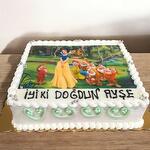 Bu renkli ve neşeli pasta, karşımıza Pamuk Prenses ve Yedi Cücelerin sıcak ve masalsı dünyasıyla çıkıyor! İyi ki Doğdun Ayşe yazısıyla süslenmiş olan pasta, doğum günleri için mükemmel bir seçenek. Üzerindeki şeker hamuru detayları ve beyaz kremalı kenar süslemeleriyle şıklığını taçlandırıyor. Çocuklar için hem eğlenceli hem de lezzetli bir tercih olan bu pasta, mutlu anları daha da tatlandıracak.