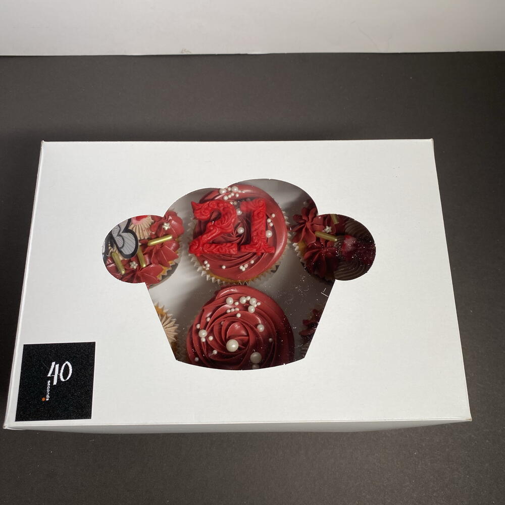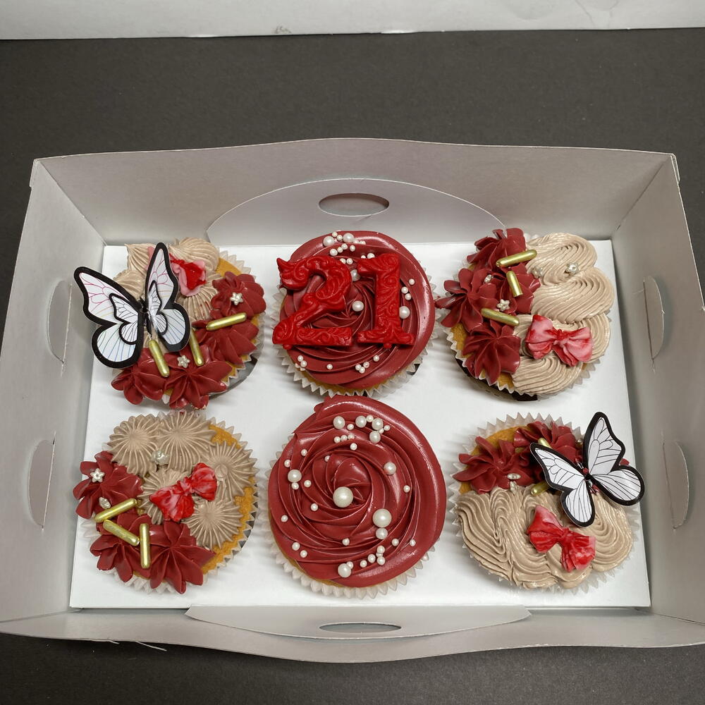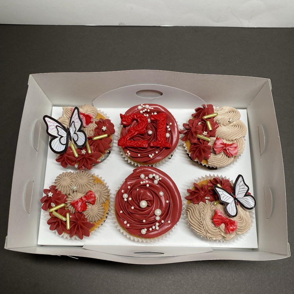 Ürün 6 adet tereyağlı cupcake ile hazırlanır. İsteğe göre vanilyalı ya da kakaolu olarak hazırlanır. Swiss mereng buttercream ile bordo ve krem renkli süslenir. 2 cupcake üzerinde kelebek konulur ve 1 tanesinin üzerinde şeker hamurundan ‘21’ yazar . İstenilen yaş yazılabilir . Notlar kısmından belirtiniz.