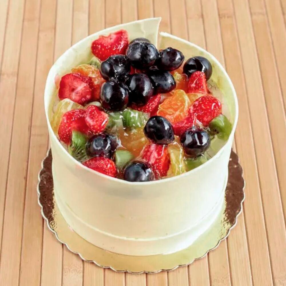 Bu, taze meyvelerle süslenmiş zarif bir meyve pastasıdır. Sulu çilek, yaban mersini ve kivi, narenciye dilimleriyle birleşerek üzerine jöleli bir kaplama ile taze ve parlak kalacak şekilde hazırlanmıştır. Beyaz çikolata bordürü, pastaya şık ve kutlama havası katmaktadır. Bu pasta, yaz aylarında ferahlatıcı bir tatlı olarak ya da herhangi bir özel günde renkli ve lezzetli bir seçenek olarak mükemmeldir.