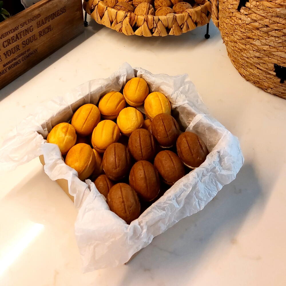 Ev yapımı özenle hazırlanan Oreski Ceviz Kurabiyesi, dışı kıyır kıyır hamuru ve içindeki aromatik ceviz dolgusu ile geleneksel tatları sevenler için özel olarak üretilmiştir. Her bir kurabiye tek tek kalıpta pişirilir ve tazeliğini koruması için hijyenik şekilde paketlenir. Altın sarısı ve kakaolu iki farklı hamurun birleşimiyle ortaya çıkan bu ceviz şeklindeki kurabiyeler; çay ve kahve yanına, misafir sofralarına ve hediye kutularına şık bir dokunuş katar. Tazeliğini uzun süre koruyan yapısı sayesinde hem lezzetli hem de dekoratif bir tatlı seçeneğidir.