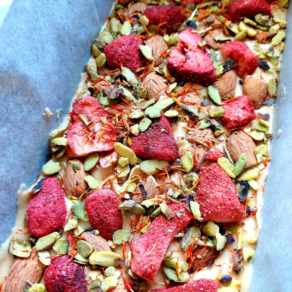 Fistik, badem, cilek kurusu, safran yapraklari, tereyağı, şeker, katki ve koruyucu icermeye süt tozu.