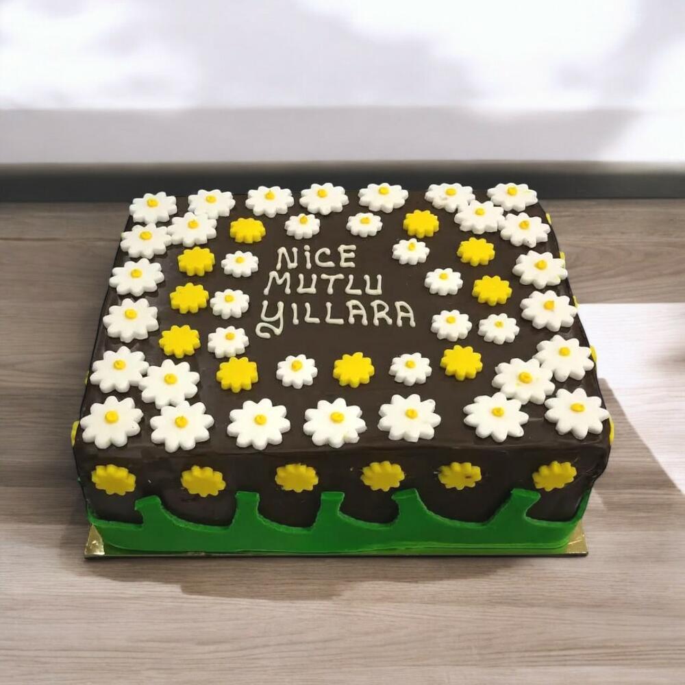 Görseldeki pasta, hem görselliği hem de lezzetiyle dikkat çekiyor. Üzerindeki beyaz ve sarı çiçek desenleriyle yazın ferahlığını yansıtan bu şık tasarım, Nice Mutlu Yıllara yazısıyla kutlamalar için özel bir anlam taşıyor. Çikolata kaplaması ve canlı yeşil çimen tasarımı, pastaya taze ve doğal bir hava katıyor. Özel günler, doğum günleri ve yıllık kutlamalar için mükemmel bir seçim.