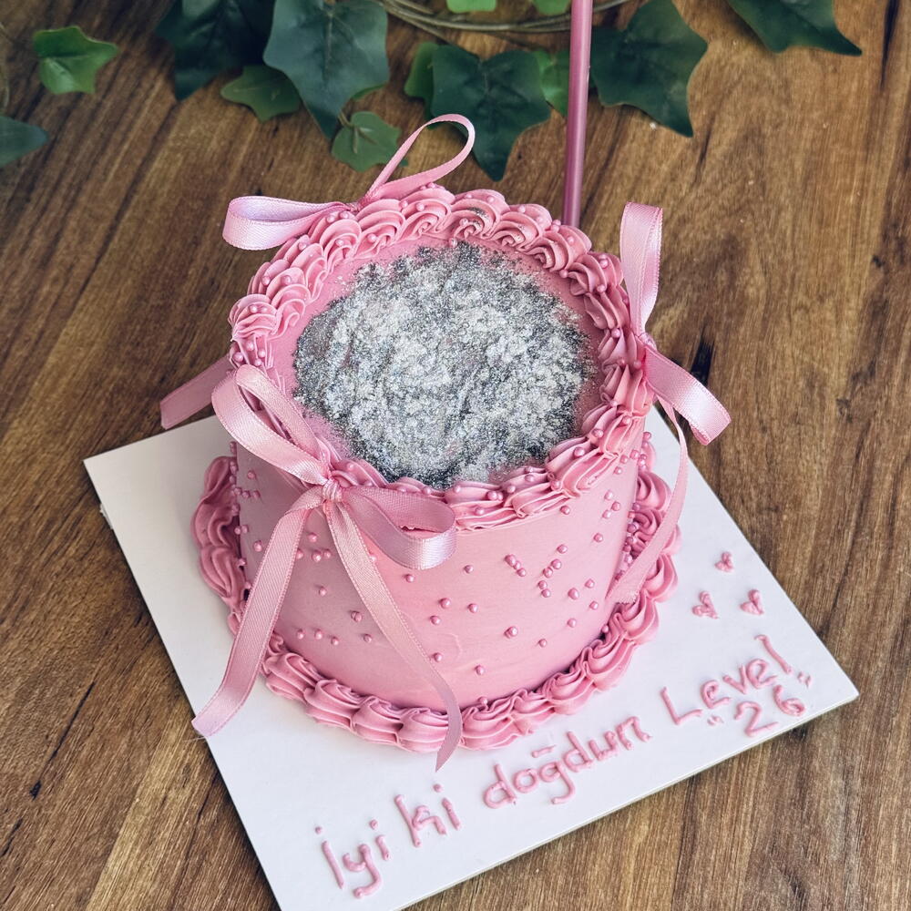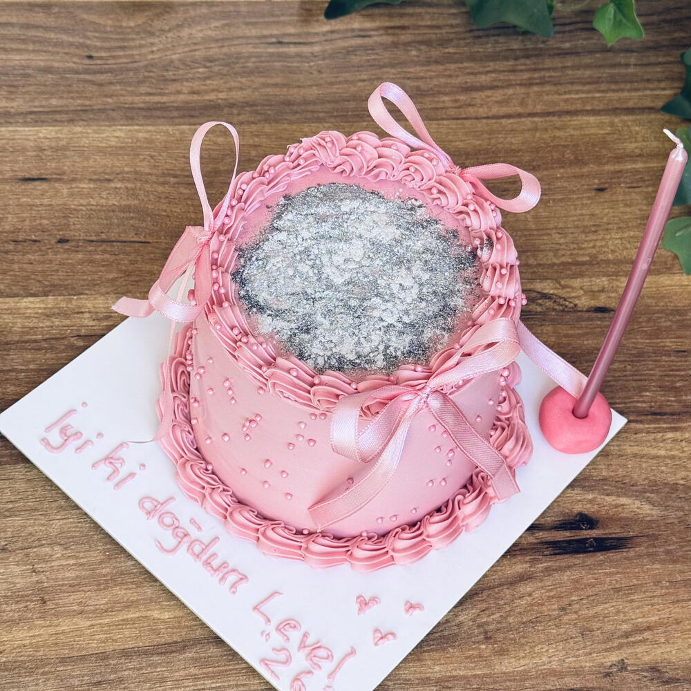 Beyaz çikolatalı labneli krema ile kaplanmıştır Üzerindeki sim ve boncuk drajeler yenilebilir
