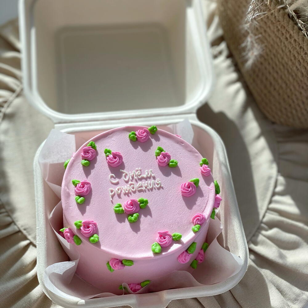 El yapımı tereyağı kreması gülleriyle tamamlanmış yumuşak ve zarif pembe bento kek. Şık bir hediye veya küçük bir kutlama için mükemmel. Favori lezzetinizi seçin ve pastayı mesajınızla kişiselleştirin.