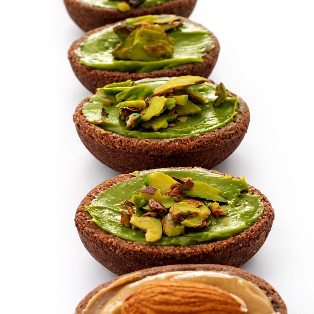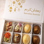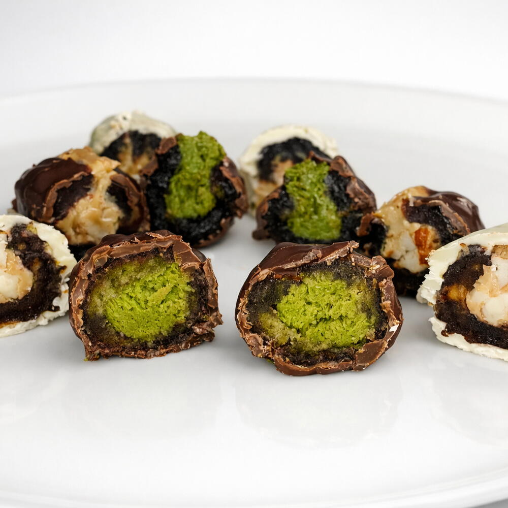 Belçika çikolatası kaplı ceviz formunda kurabiyeler (çeşitli dolgulu), Belçika çikolatası kaplı ve süslemeli Medine hurmaları (çeşitli dolgulu), kuruyemiş çeşitleri (fıstık, badem, fındık),