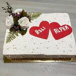Bu pasta bir düğün pastası olarak mükemmel bir seçenek! Romantik detayları, kırmızı kalp şekilleri ve kişisel yazılarla süslenmiş olması, bu pastayı özel bir kutlama için ideal hale getiriyor. Beyaz kreması, zarif çiçek süslemeleri ve ince şeker incileriyle, düğün havasını mükemmel bir şekilde yansıtıyor. Bu şık pasta, çiftler için unutulmaz bir kutlama anı yaratacak. Hem görsel hem de lezzet açısından harika bir tercih olan bu pasta, özel günlerde tatlı bir başlangıç olacak. Taze kalabilmesi için serin bir ortamda saklanması önerilir.