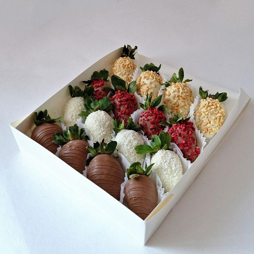Çeşitli tatlarda çikolataya batırılmış lezzetli çilek karışımı 🍓 Bu kutuda süt ve beyaz çikolataya batırılmış çilekler, gevrek kuruyemişler, hindistancevizi parçacıkları ve canlı dondurularak kurutulmuş ahududularla süslenmiş — her lokmada dokuların ve tatların mükemmel bir karışımını sunar. Herhangi bir etkinlik için güzel ve çok yönlü bir hediye — canlı, zarif ve lezzet dolu. ✨ Bir kutuda çeşitli tatlar ✨ Doğal, yüksek kaliteli malzemeler ✨ Zarif hediye ambalajı ✨ Her gün taze hazırlanır