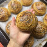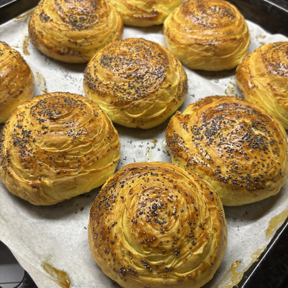 Azerbaycan Gogalı – Geleneksel Kat Kat Hamur İşi İnce, hassas hamur katmanlarıyla hazırlanan gerçek Azerbaycan gogalı, dışı altın renginde ve çıtır çıtır kızarana kadar pişirilir, içi ise yumuşak ve aromatik kalır. Hamur işi güzel bir spiral şeklinde şekillendirilir ve ekstra lezzet ile doku için üzeri haşhaş tohumu ve susamla kaplanır. Bu geleneksel hamur işi zengin tereyağlı katmanları ve benzersiz tadıyla bilinir. Kahvaltı, çay saati veya özel ev yapımı bir ikram için mükemmeldir. ✨ Taze malzemelerle el yapımı ✨ Hafif, kat kat gevrek ve aromatik ✨ Geleneksel Azerbaycan tarifi Sıcak, yeni pişmiş bir gogalı çay veya kahve ile tadını çıkarın ve gerçek ev yapımı fırın lezzetinin tadını deneyimleyin.