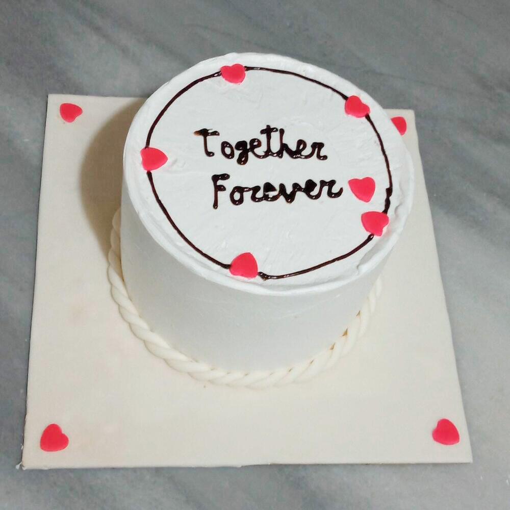 Bu zarif ve romantik pasta, Together Forever yazısıyla özel anlar için harika bir tercih! Beyaz krema ile kaplanmış pastanın üzerinde minik kırmızı kalp şekilleri, pasta tasarımını hem tatlı hem de anlamlı kılıyor. Sade ama etkileyici bir tasarıma sahip olan bu pasta, sevdiklerinize olan duygularınızı en tatlı şekilde ifade etmek için mükemmel bir seçenek. Çevresindeki şık şerit detayı ve üstündeki yazı, onu kişisel bir hediye haline getiriyor. Özel günlerde ya da romantik kutlamalarda kullanabileceğiniz bu pasta, lezzetli olduğu kadar görsel olarak da göz alıcı. Taze kalabilmesi için bu pastayı serin bir ortamda saklamanızı öneririz.