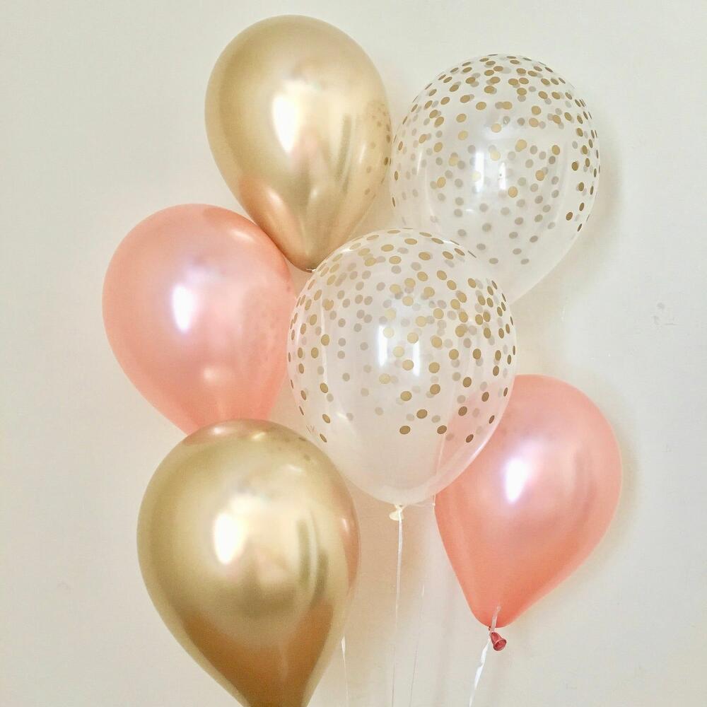 122pc gold chrome balloon. 122pc rose metallic balloon. 122pc gold confetti balloon.