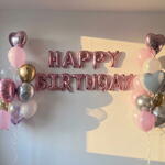 6 adet folyo kalp balon, 24 adet. Helyum balon, bir adet happy birthday yazılı balon seti
