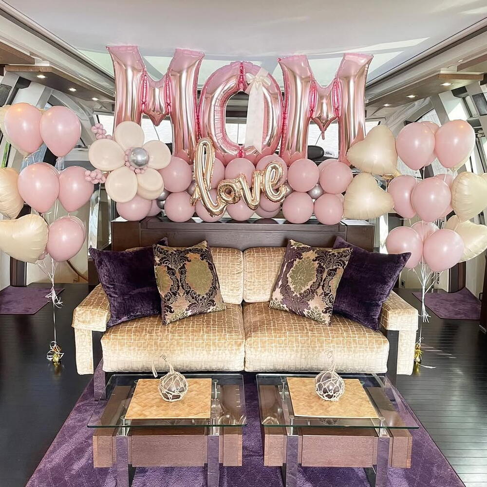 18 adet pembe helyum balon 6 adet bej kalp folyo balon 1 adet MOM 1 adet LOVE 28 adet standart balon 24 adet standart küçük balon Bulunmaktadır.