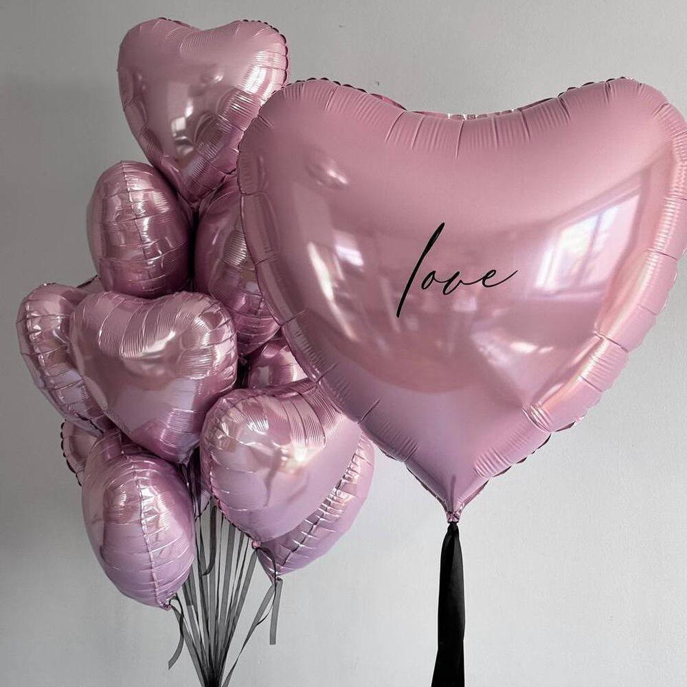 Çapı 32 cm olan yazılı balon ve 10 adet pembe kalp balondan oluşan set