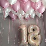Pembe beyaz tasarı. 25 adet yuvarlak toplarla birlikte 2 adet 1 metrelik rakamlar tercihe göre değişmektedir resimdeki örnek modeldir lütfen siparişle birlikte iletişime geçerek olmasını istediğiniz sayıyı belirtiniz 🥰❤️