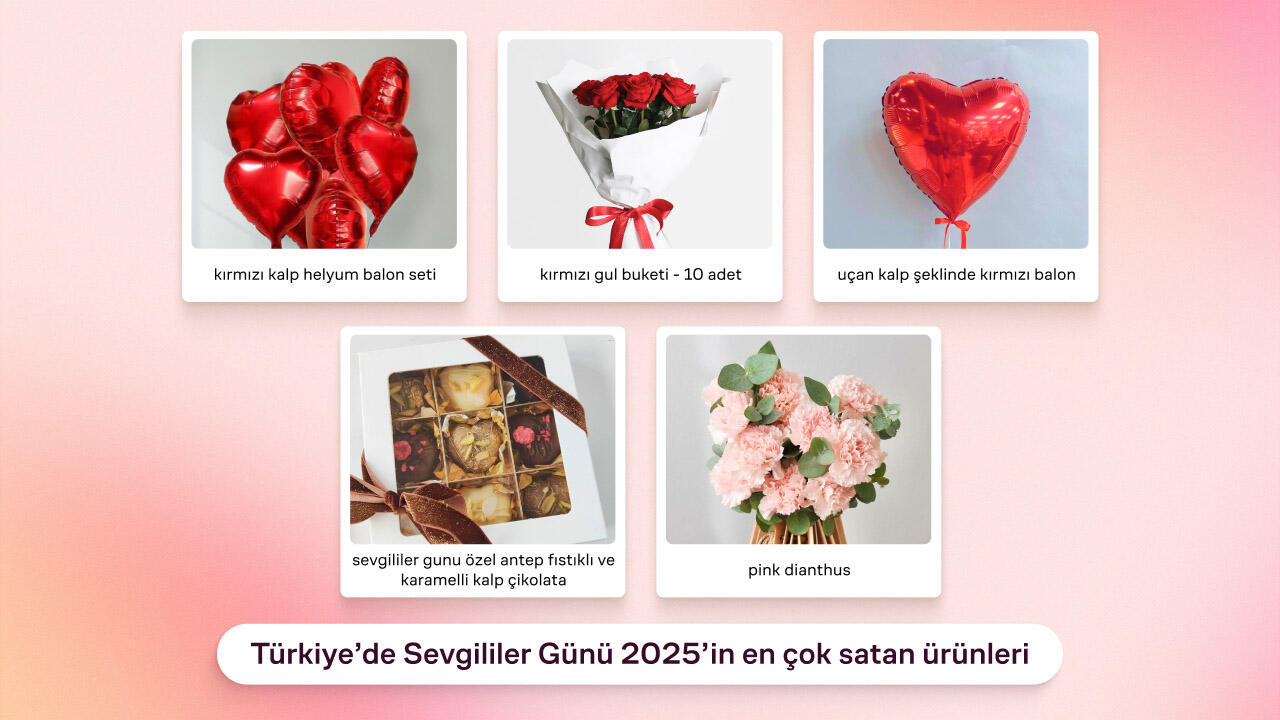 2) Türkiye’de talep gören ürün türlerini öne çıkarın: Kırmızı Kalp Helyum Balon Seti, 10 Kırmızı Gül, Uçan Kalp Balon, Kalp Çikolata (Antep fıstıklı/karamelli), Pink Dianthus
