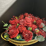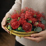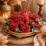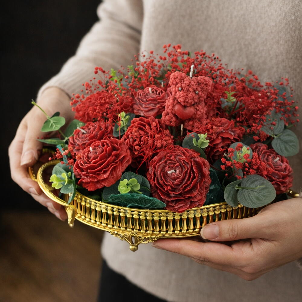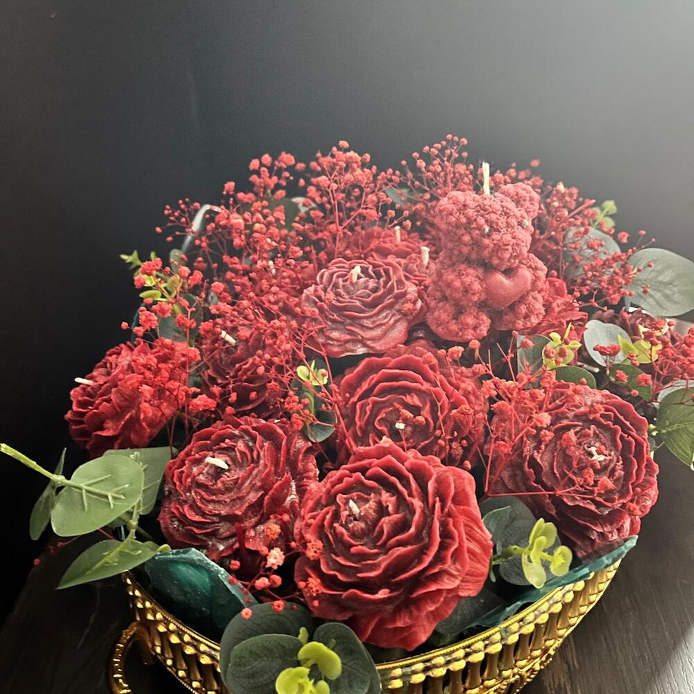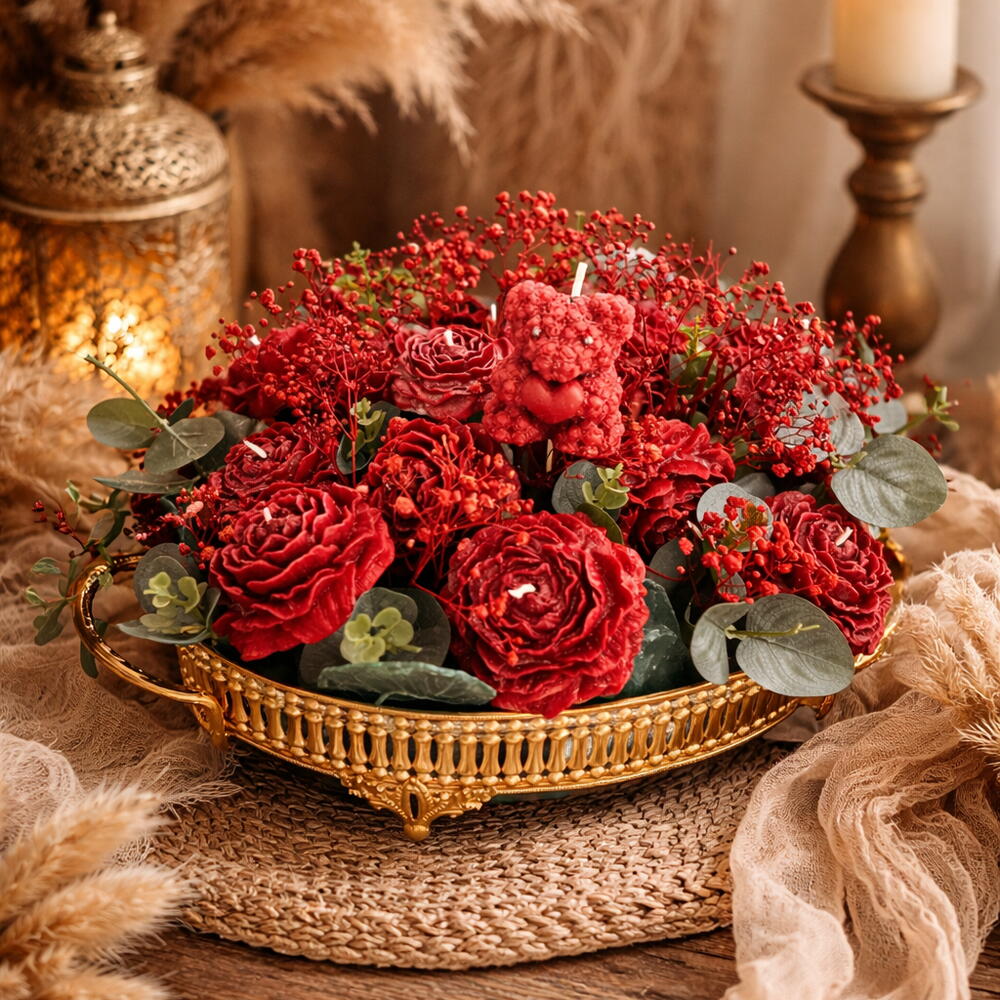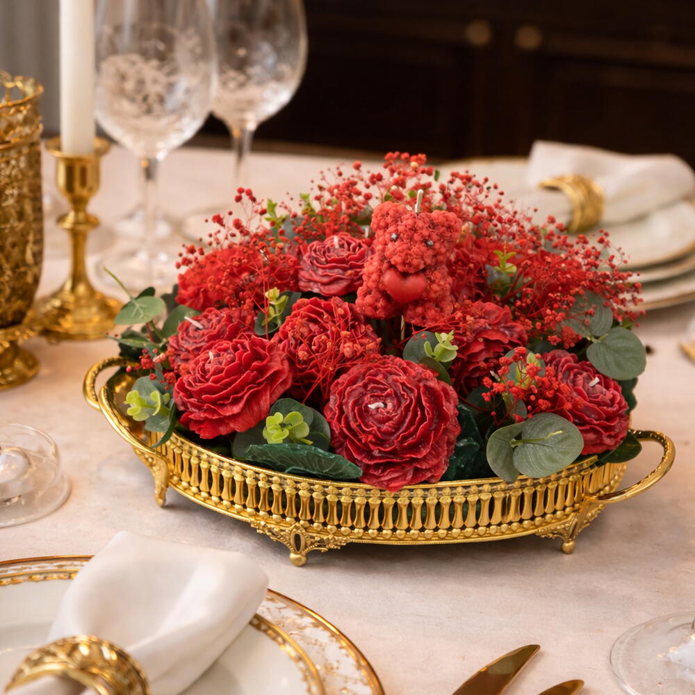 Kızıl İhtişam – El Yapımı Çiçekli Mum Aranjmanı 40 cm genişliğe ve 12 cm yüksekliğe sahip bu gösterişli dekoratif mum aranjmanı, özel gün sofralarınıza zarafet katmak için tasarlanmıştır. Altın detaylı şık tepsi üzerinde kırmızı gül formunda el yapımı mumlar ve dekoratif çiçeklerle hazırlanmıştır. Nişan, söz, isteme, Sevgililer Günü ve özel davet konseptleri için ideal bir masa ortası tasarımıdır. Ürün tamamen el yapımıdır ve sipariş üzerine özenle hazırlanmaktadır. 📏 Ölçü: 40 cm genişlik – 12 cm yükseklik 🕯 Dekoratif ve kullanıma uygun mum tasarımı 🎁 Özel günler için şık hediye alternatifi