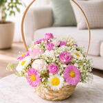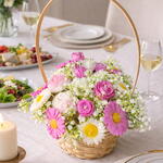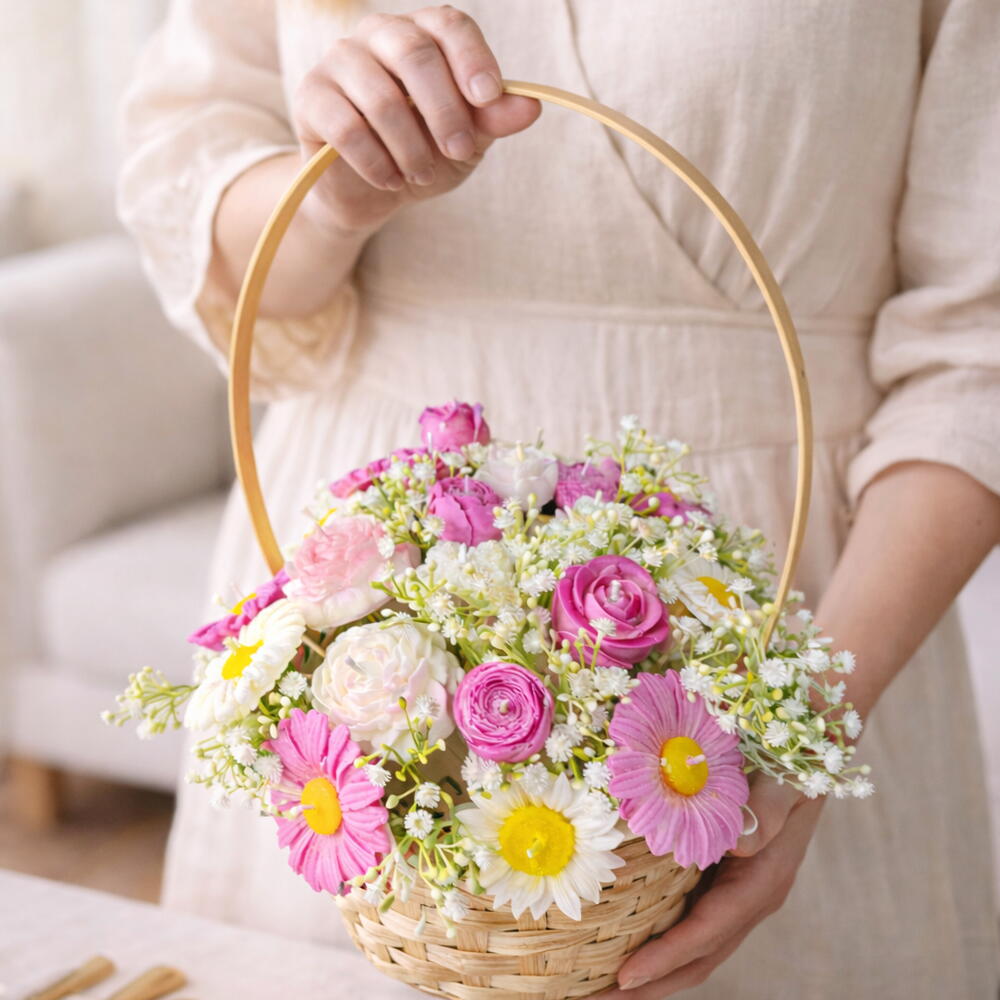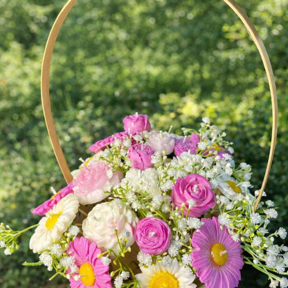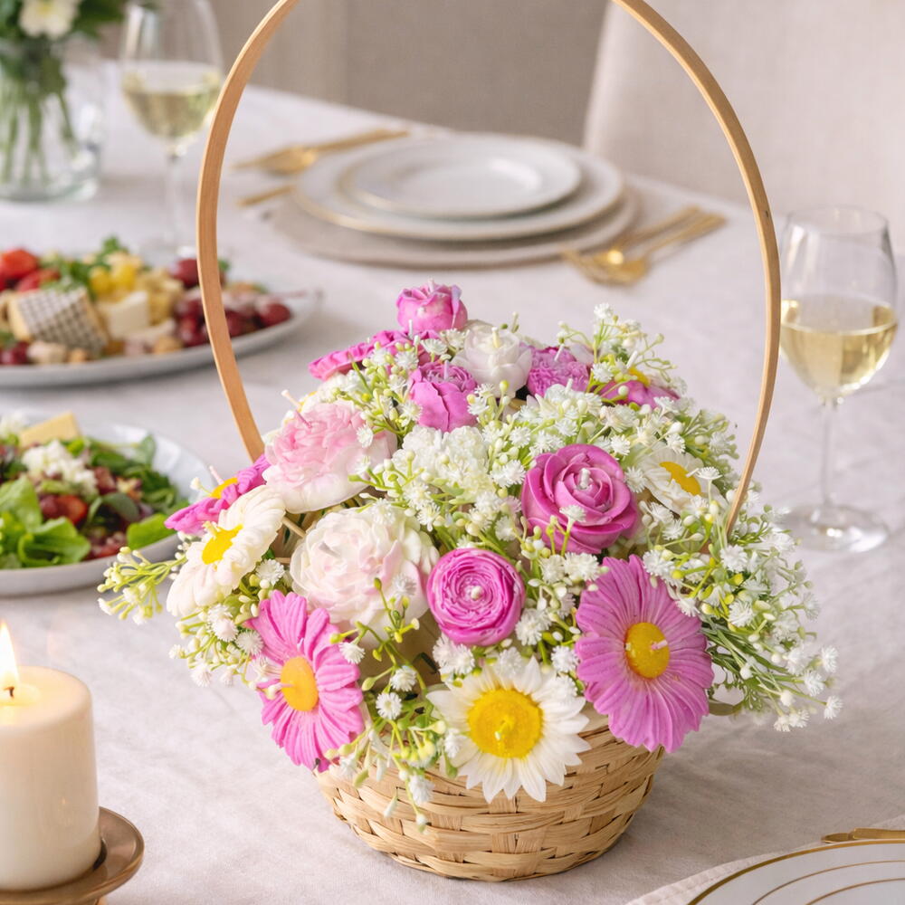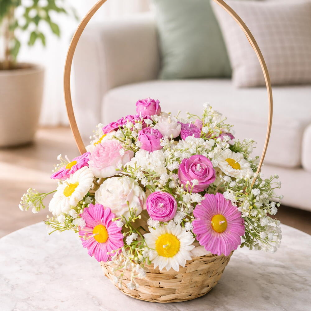Doğal hasır sepet içerisinde el yapımı çiçek form mumlardan oluşan özel tasarım aranjman. Pembe, beyaz ve papatya detaylarıyla bahar enerjisini yansıtan şık ve zarif bir hediye alternatifidir. Her bir mum özenli el işçiliği ile hazırlanmıştır. Dekoratif görünümü sayesinde masa üstü, yemek masası ve özel davet konseptlerinde şık bir tamamlayıcıdır. • El yapımı çiçek form mum tasarımı • Doğal hasır sepet sunum • Özel gün, söz, nişan ve davet konseptlerine uygun • Dekoratif kullanım için idealdir Not: Ürün dekoratif amaçlıdır. Yakılacaksa gözetim altında kullanılmalıdır.