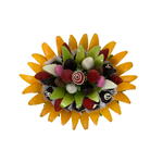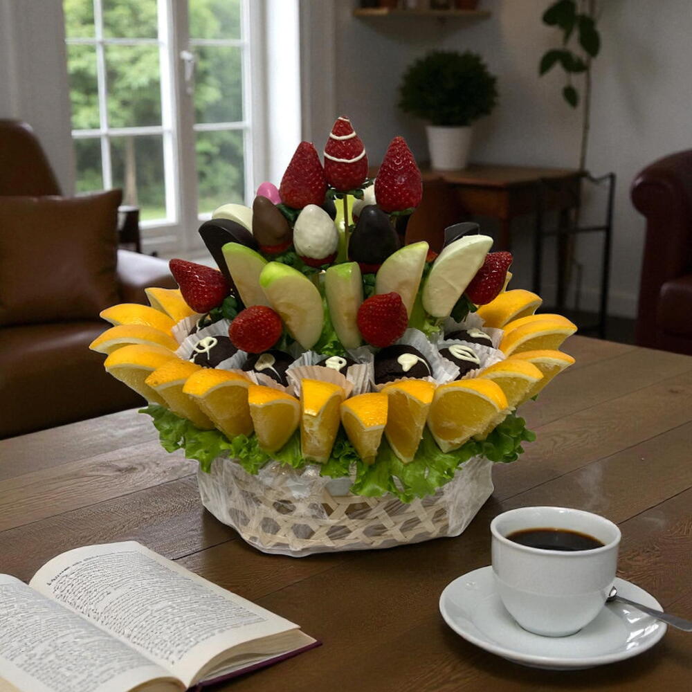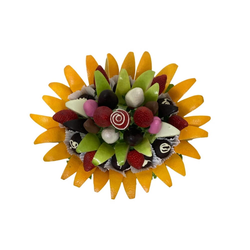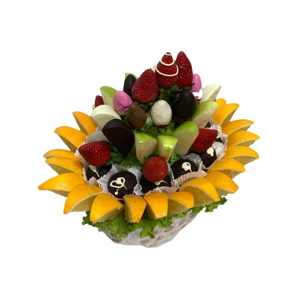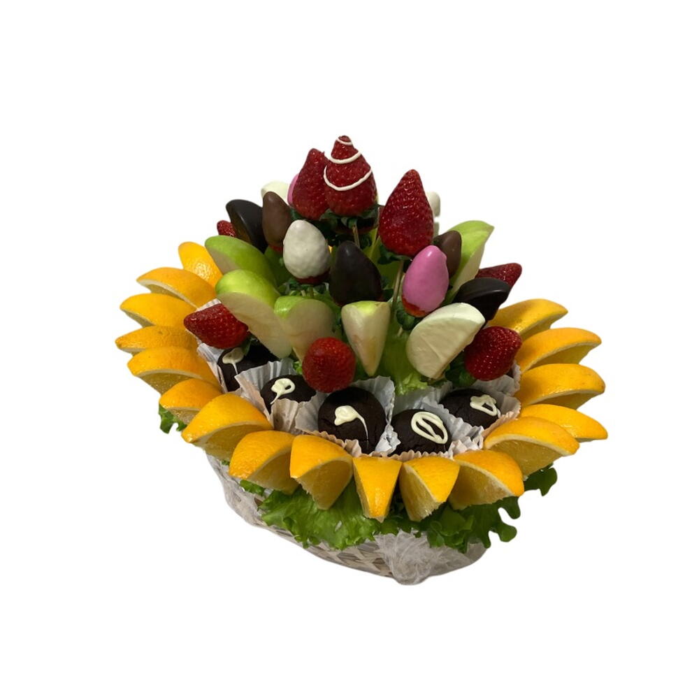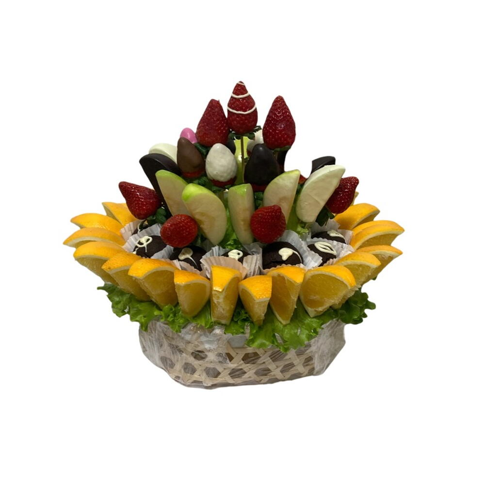 Lezzeti ve sağlıklı içeriği birleştiren ideal hediye! Karışık Meyveli Zengin Çikolata Sepeti, taze çilek, elma dilimleri ve portakal gibi vitamin deposu meyveleri, gurme çikolata topları ile bir araya getirir. Yeşil marul ve portakal dilimleriyle çevrili bu aranjman, geçmiş olsun hediyesi, ev hediyesi veya doğum günü sürprizi için hem taze hem de tatlı bir alternatiftir. Ürün İçeriği * 24 Adet Portakal Dilimi * 12 Adet Browni Kek * 8 Adet Elma Dilimi * 4 Adet Çikolata Kaplı Elma Dilimi * 9 Adet Çilek * 8 Adet Çikolata Kaplı Çilek