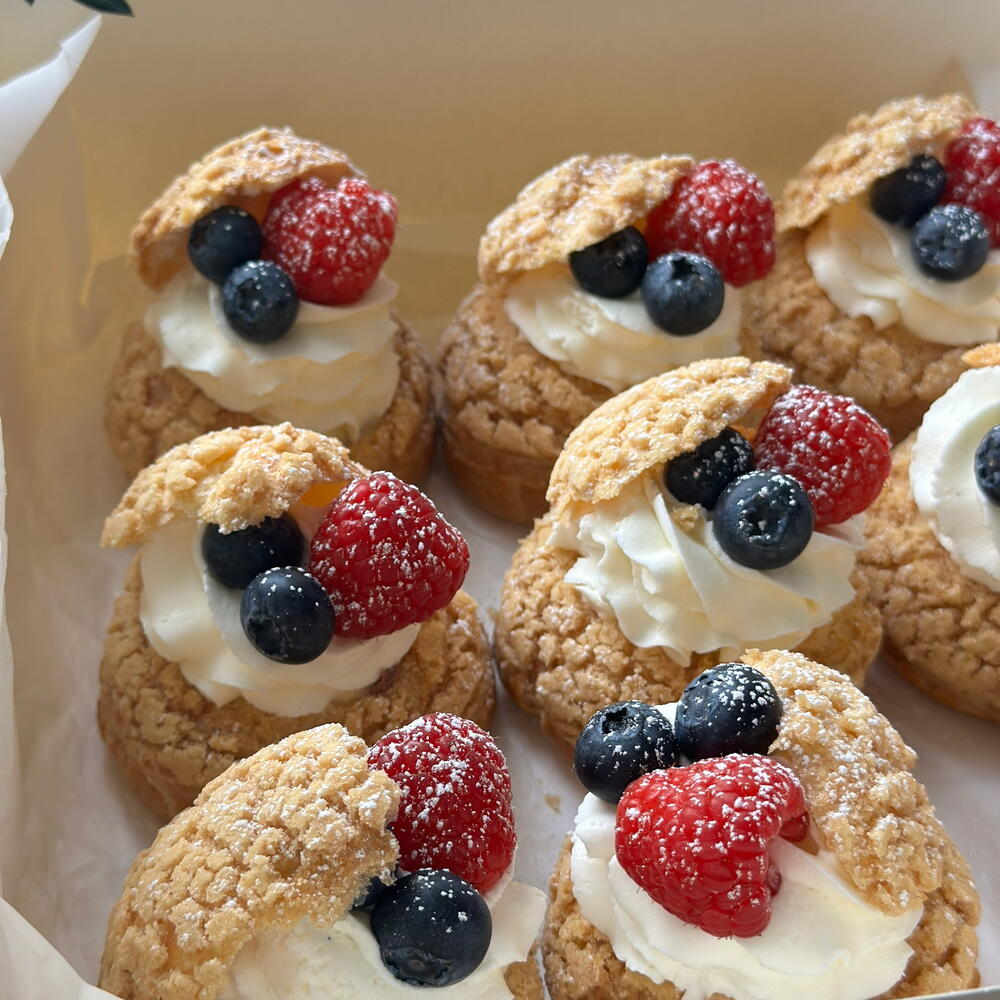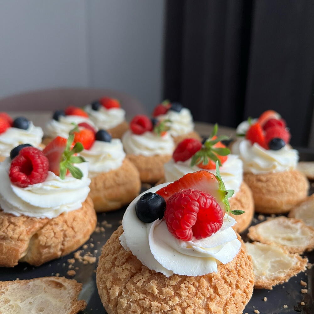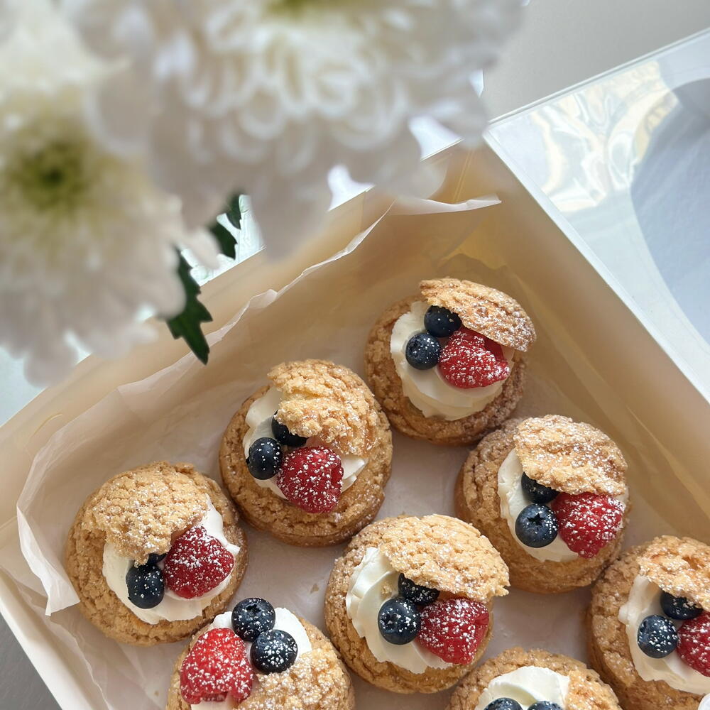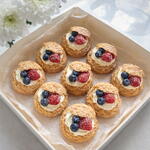 Elegant cakes filled with light vanilla cream and topped with fresh fruit. Each piece is decorated with raspberries and blueberries, with a light dusting of powdered sugar as the finishing touch. The combination of the crisp pastry, soft cream, and fresh fruits offers a balanced and delicious dessert experience. A chic and lovely choice for celebrations, gifts, or a sweet break alongside coffee. 9 pieces