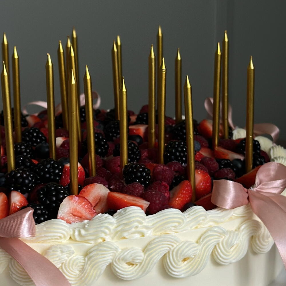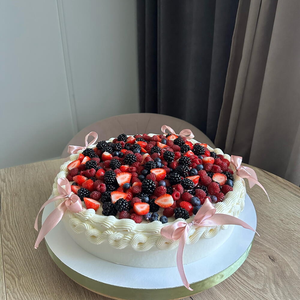 A beautiful handmade celebration cake decorated with a generous layer of fresh berries including strawberries, raspberries, blackberries and blueberries. The cake is finished with delicate cream decoration and elegant ribbon accents, creating a luxurious and festive look. Perfect for birthdays, celebrations and special moments. Light, fresh and full of natural berry flavor.