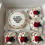 A stylish and elegant dessert set featuring a mini bento cake with a birthday message and 5 matching cupcakes decorated with smooth cream swirls, fresh berries, and tiny red hearts. A perfect gift for a loved one — delicate, beautiful, and made with care to create a special moment.