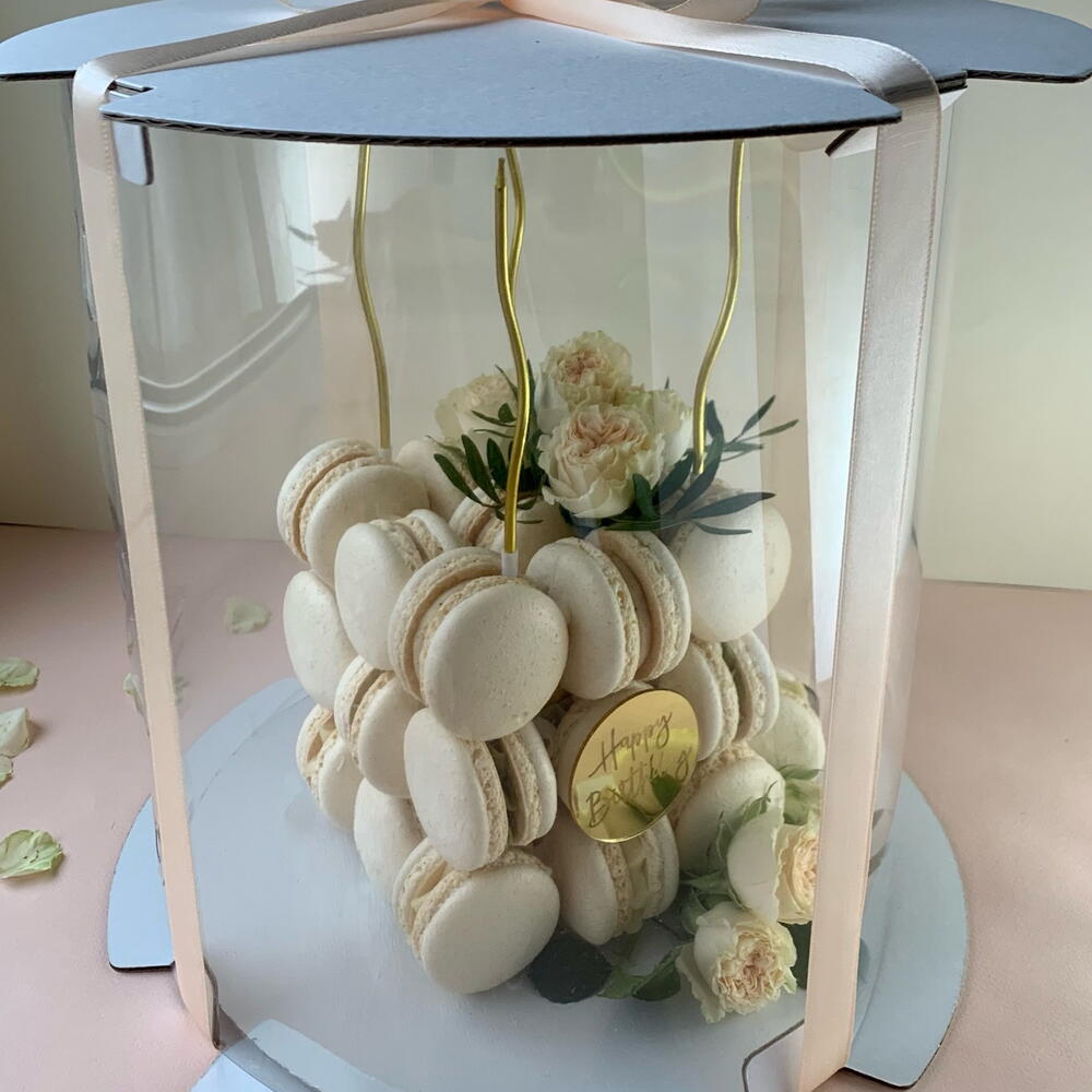 A refined and elegant macaron cake made of delicate vanilla macarons with a light creamy filling. Decorated with fresh flowers and stylish candles, this cake is perfect for birthdays and special occasions. A beautiful combination of minimalism, luxury design, and delicate taste.