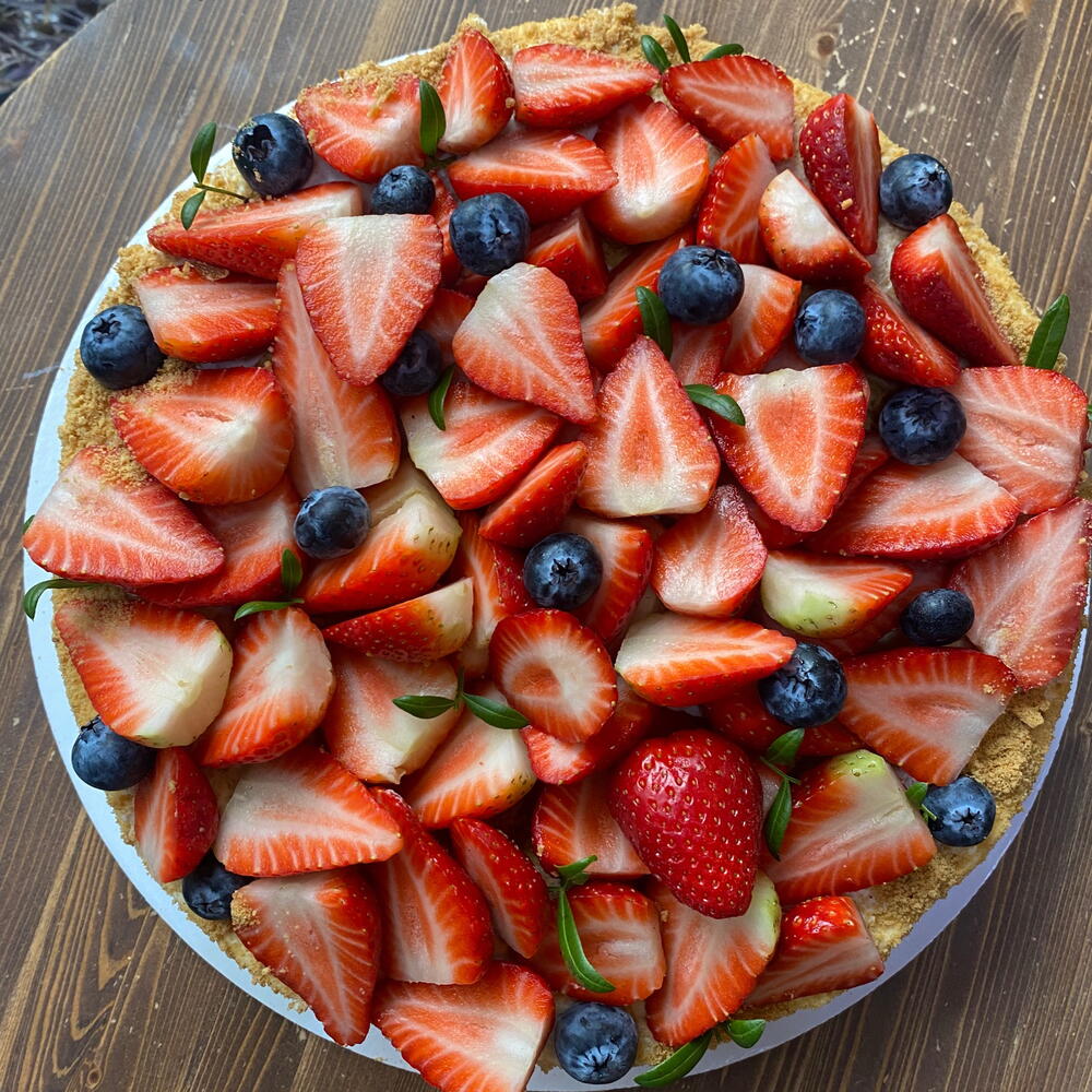 Classic homemade Medovik with soft honey layers and delicate cream. The cake has a rich honey flavor, tender texture, and a perfectly balanced taste. Decorated with fresh strawberries and blueberries, and covered with fine honey crumbs, it looks natural, elegant, and appetizing. Perfect for celebrations, gifts, or a cozy dessert.