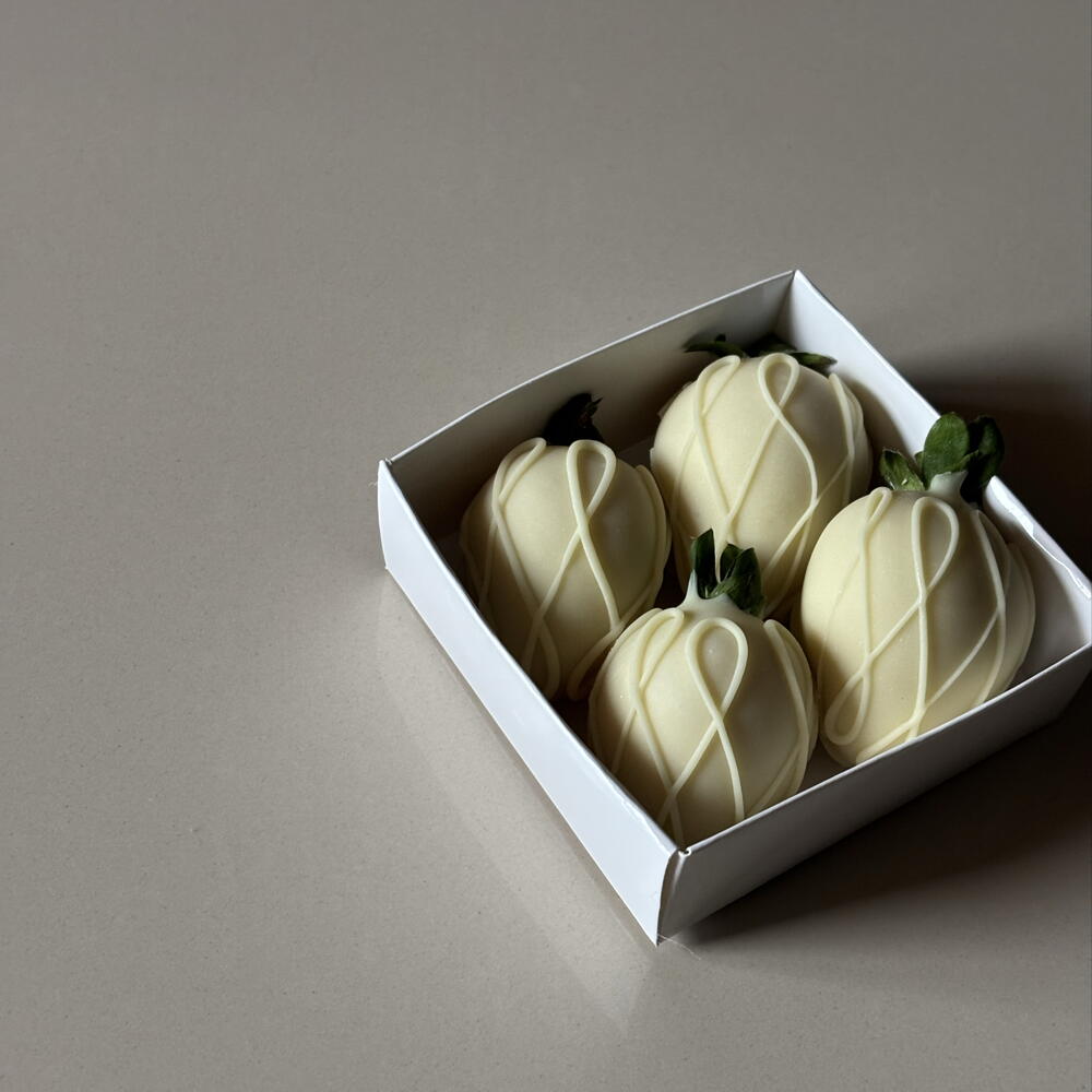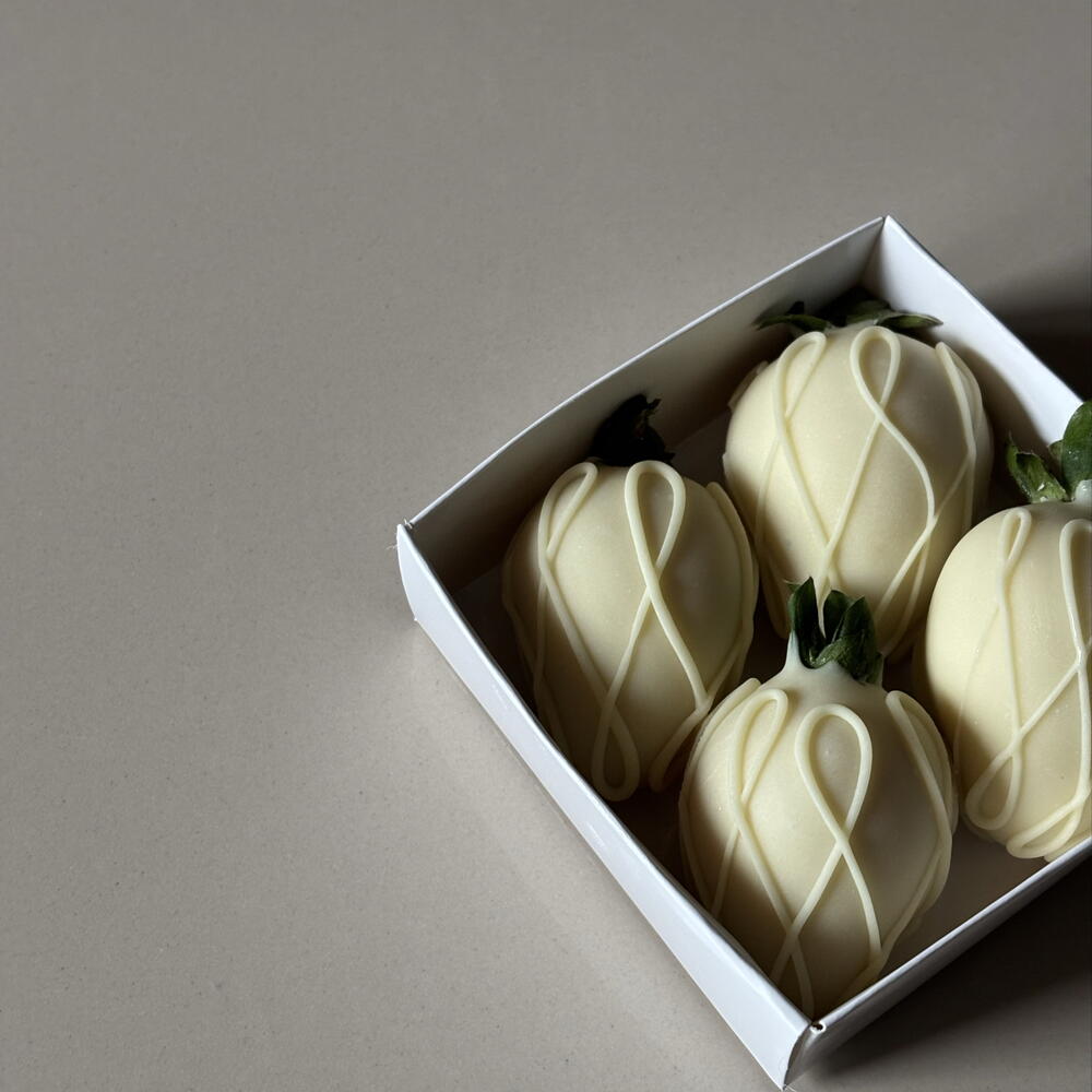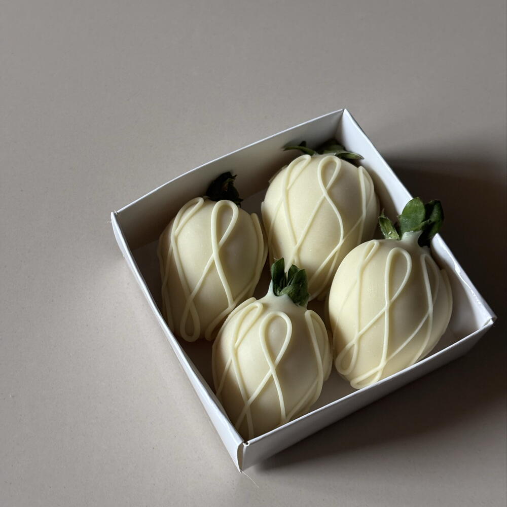 Fresh strawberries coated in chocolate made with natural ingredients and the finest quality. Perfect for expressing love to your close ones. strawberries, white chocolate (sugar, cocoa butter, whole milk powder, whey powder, emulsifiers (soy lecithin, polyglycerol polyricinoleate), salt, flavoring.)