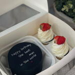 A stylish and minimalist dessert set featuring a dark bento cake with a personalized birthday message, paired with 2 cupcakes topped with silky cream and fresh strawberries. Elegant, modern, and perfect for a thoughtful birthday gift.