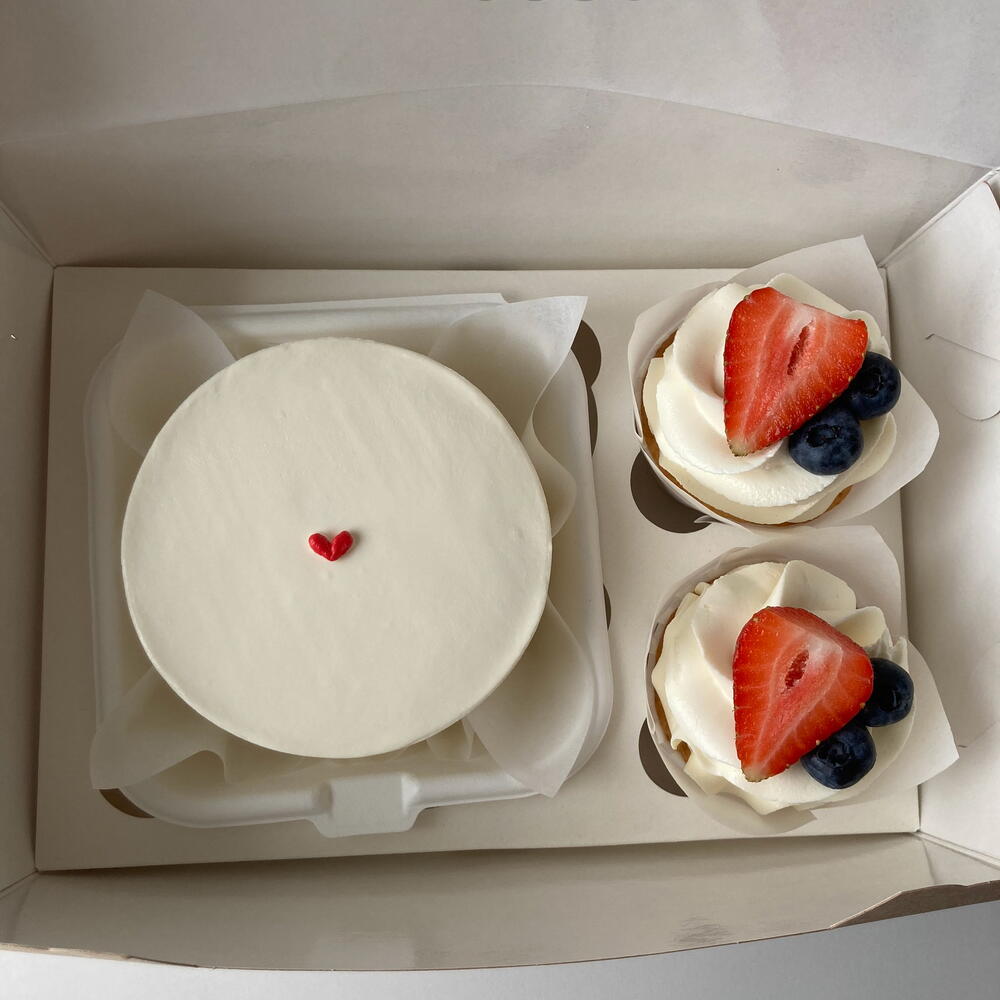 A clean and elegant dessert set featuring a minimalist bento cake with a tiny red heart detail, paired with 2 cupcakes topped with silky cream and fresh strawberries and blueberries. Simple, stylish, and perfect for intimate celebrations or a sweet gift for someone special.700