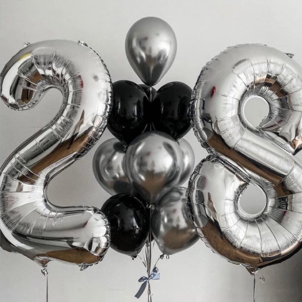 Eleven chrome, black, and silver balloons and two large numbers. You can change the color. You can also order soft toys, sweets, and cakes from us.