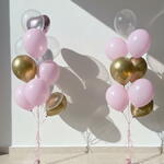 5 heart-shaped foil balloons, 15 helium balloons (pink, gold, and transparent colors)