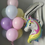 Delicate set of balloons with a unicorn! 10 multicolored balloons combined with a unicorn and a number! You can change the color scheme or additionally purchase one more number by indicating this in the order And don't forget the cake !