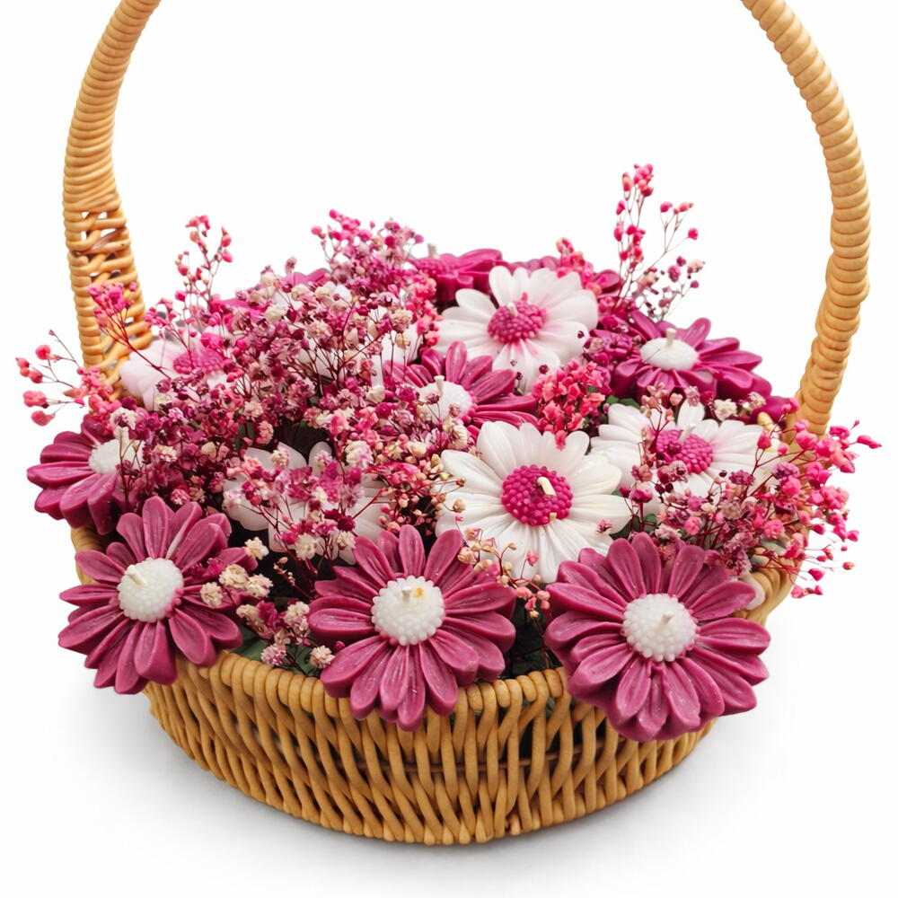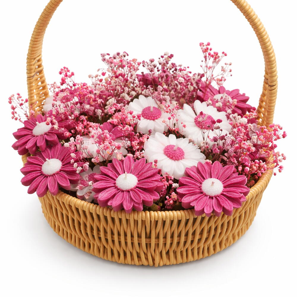 This special arrangement, prepared with handmade soy candles shaped like flowers in a wicker basket, offers a natural, elegant and romantic look. Thanks to the harmony of pink and white tones, it serves as both a decorative and meaningful gift option. Made using natural soy wax and a cotton wick. Suitable both for decorative purposes and for use. It can be chosen as a stylish complement in home decoration. It is an elegant gift option for Mother's Day, birthdays, Teacher's Day and special surprises. 🕯 Handmade soy candle 🧺 Wicker basket design 🌸 Flower-detailed decorative arrangement ⏳ Carefully prepared to order.