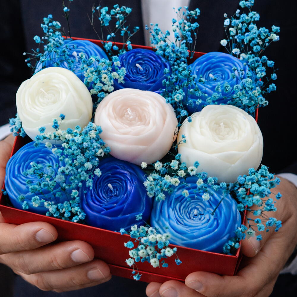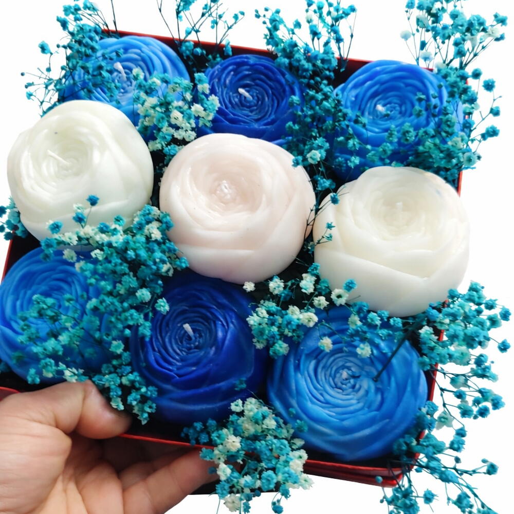 Safir Bahçe – Handmade Soy Candle Box This special candle arrangement, designed in shades of blue and white, consists of handmade soy candles shaped like elegant flowers. It comes in a stylish box, completed with decorative flower details to offer an aesthetic and modern look. Made using natural soy wax and a cotton wick. Suitable for both decoration and use. It can be chosen as a meaningful gift option for special occasions. A stylish choice for gifts for men, birthdays, anniversaries, and special surprises. 🕯 Handmade soy candle 🎁 Gift-themed design ⏳ Carefully prepared to order.