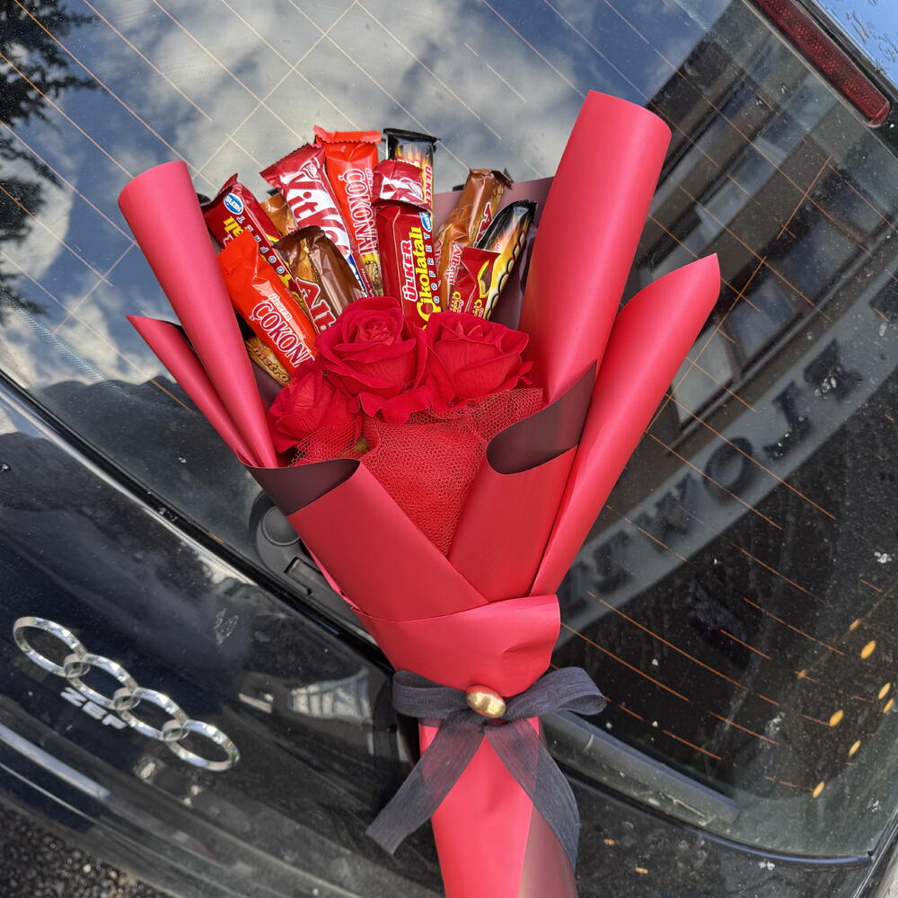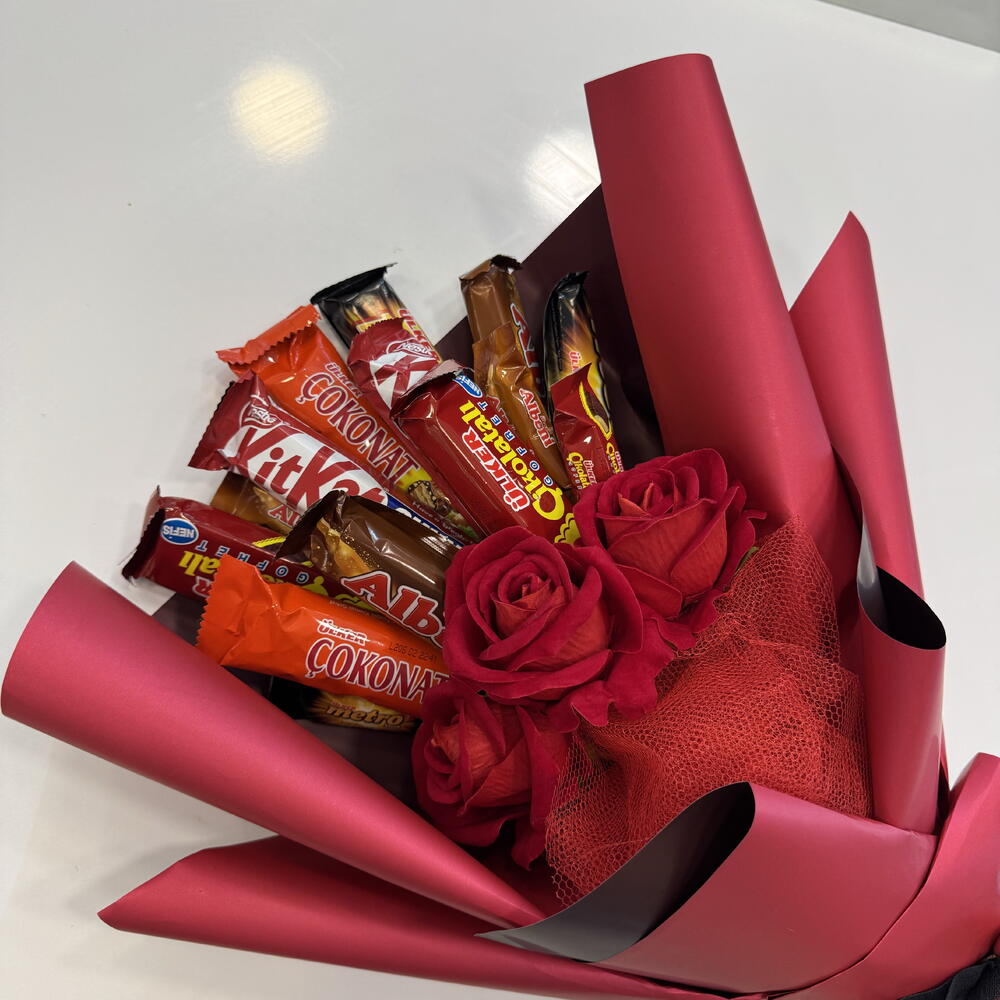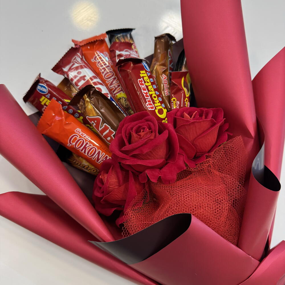 This sweet bouquet consists of a mix full of romance and sweetness. The beauty of 3 artificial red roses is complemented by flavors specially selected for chocolate lovers: 3 chocolate wafers, 2 Metro chocolates, 2 Kit Kat, 2 hazelnut chocolates and 2 Albeni chocolates accompany it. Additionally, 3 mini Metro chocolates will add a small but unforgettable touch to your bouquet. This perfect combination appeals to both the eye and the palate.