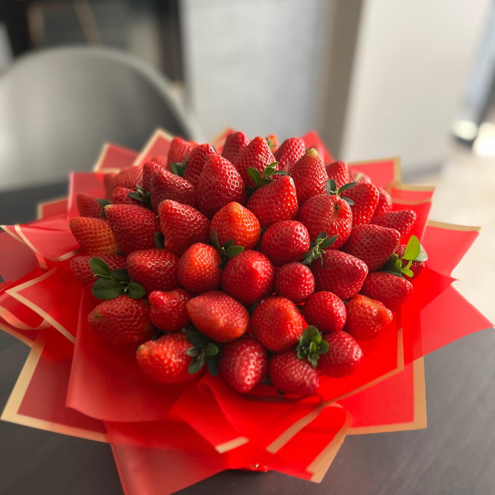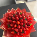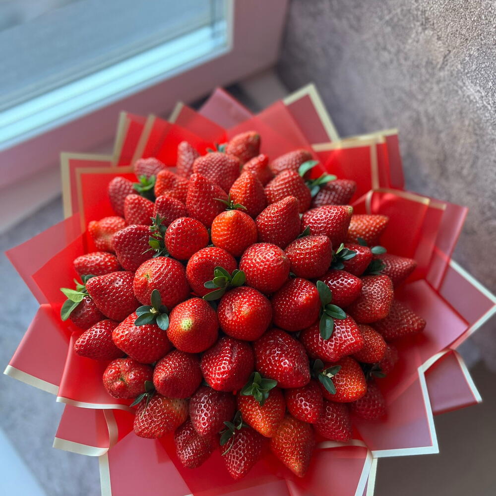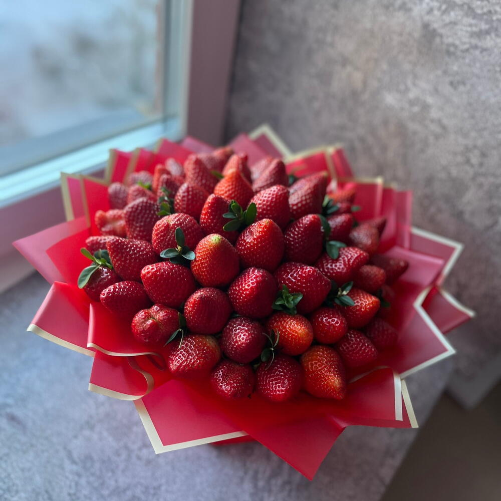 A luxurious bouquet made of fresh, juicy strawberries arranged in a dense, elegant composition. Each berry is carefully selected for its size and quality to create a visually stunning and delicious gift. Perfect for birthdays, romantic occasions, or as a unique edible surprise. The bouquet is beautifully wrapped and ready to impress from the first glance.